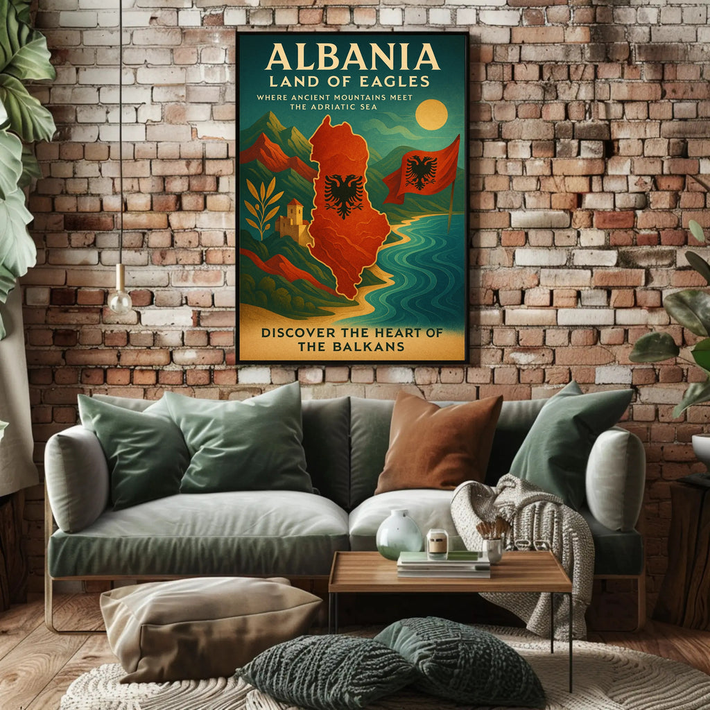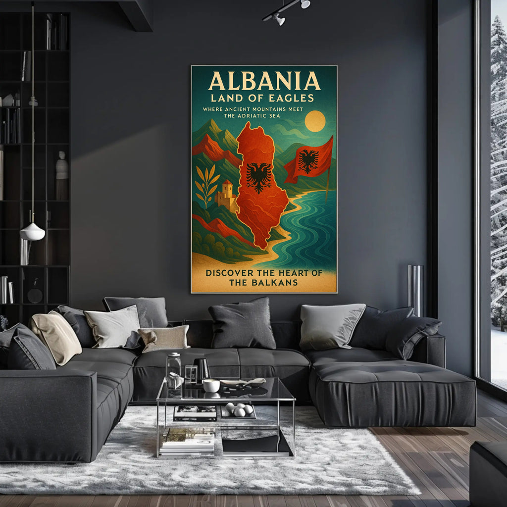 Distinctive imagery: The poster highlights Albania’s map outline, national eagle motif and dramatic mountain-to-sea landscape — perfect for anyone who loves scenic or cultural wall art.