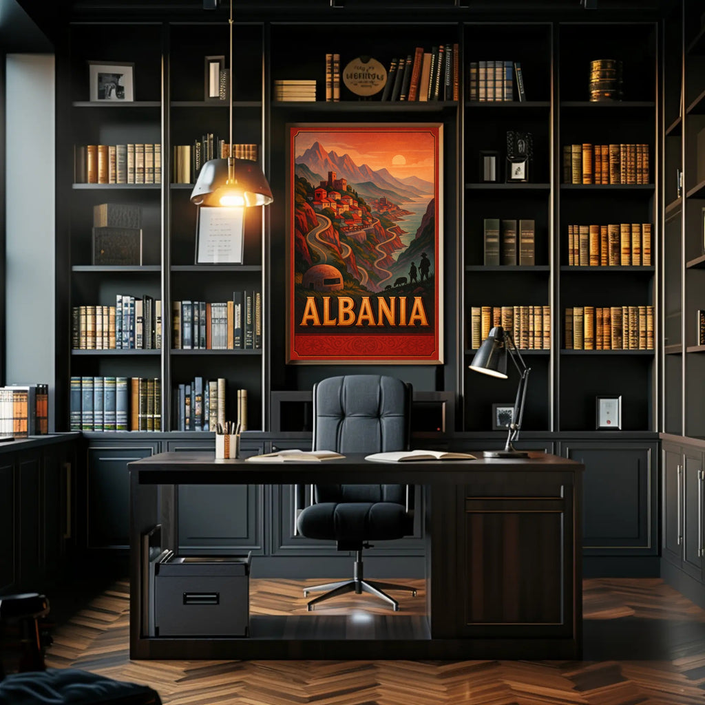 Stunning Visuals: Featuring a picturesque view of Albania, this poster transports you to its scenic landscapes, creating a tranquil atmosphere.