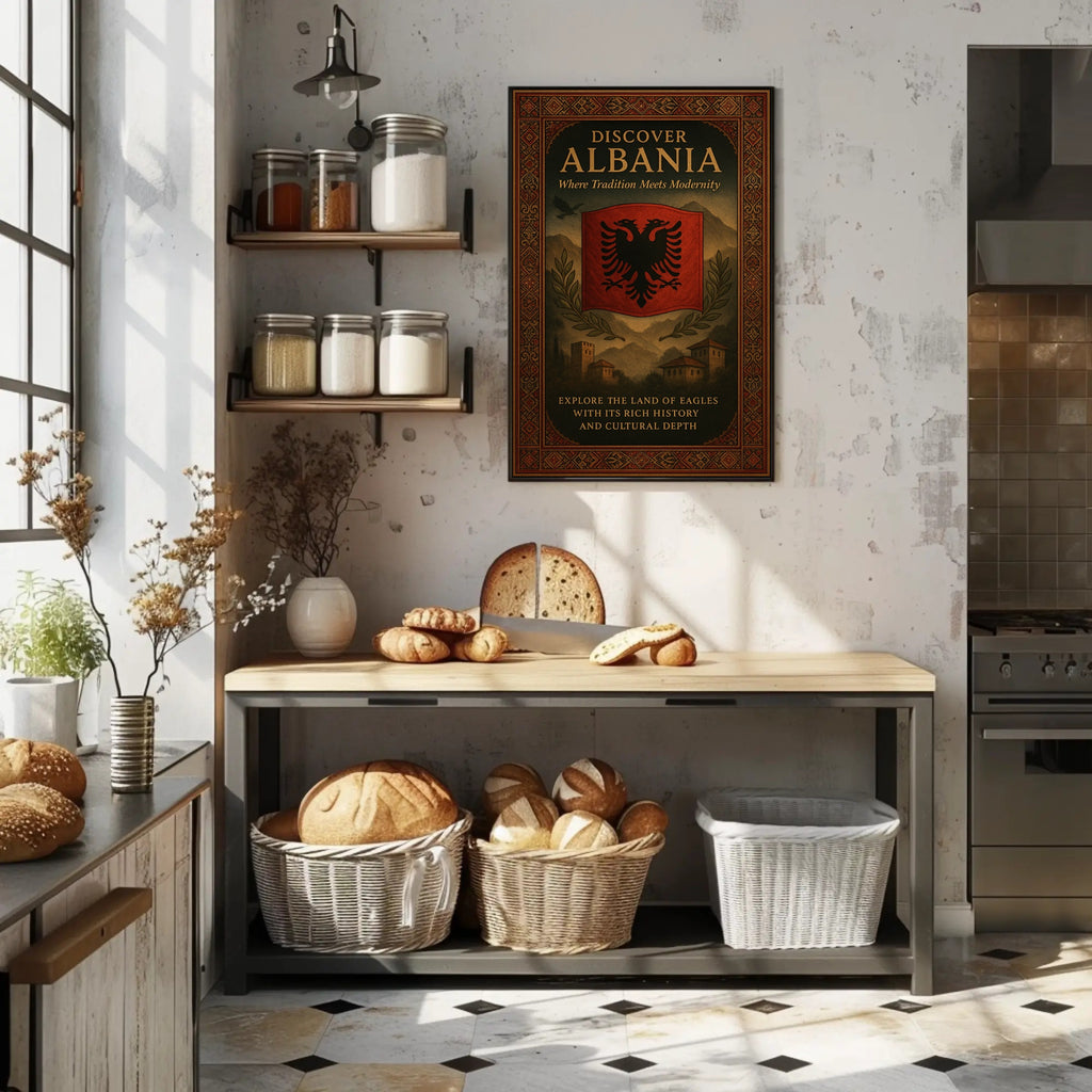 This museum-style print features the iconic double-headed eagle set against a bold red banner, framed by intricately patterned borders and a moody mountainous landscape. Photorealism-inspired textures and warm, antique tones evoke Albania’s traditional motifs and historic architecture, making it a standout piece for any room.
