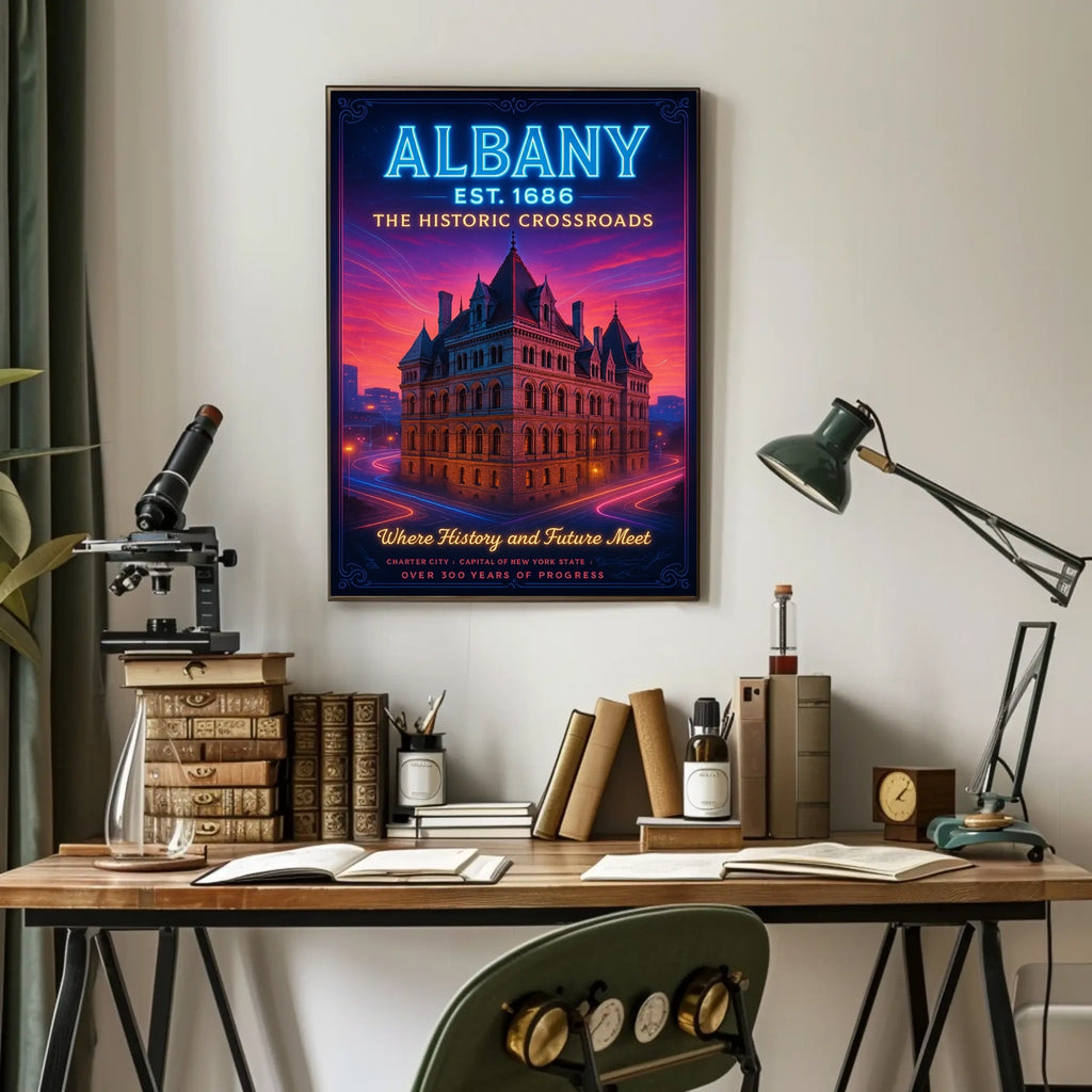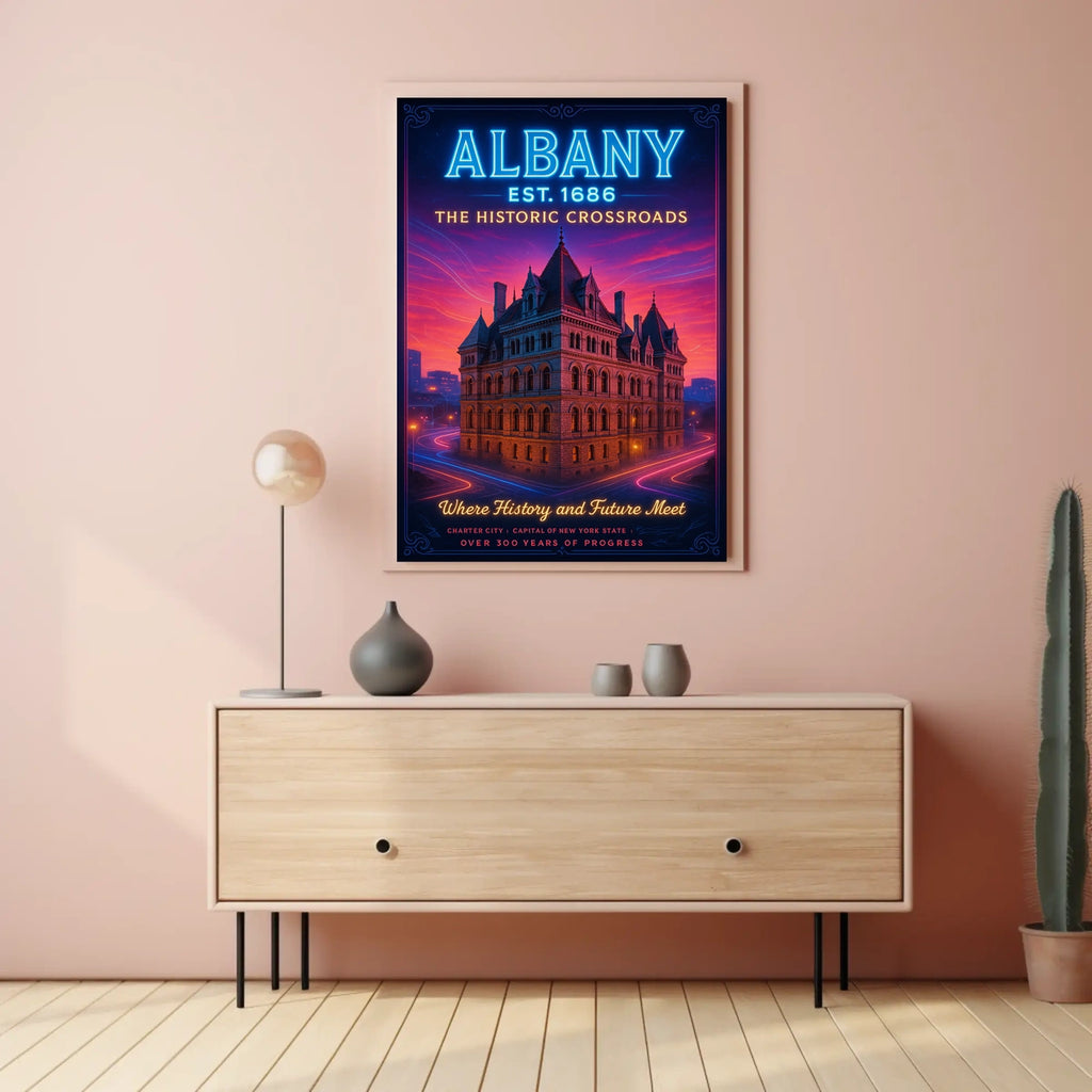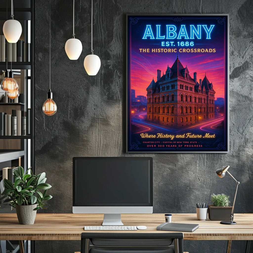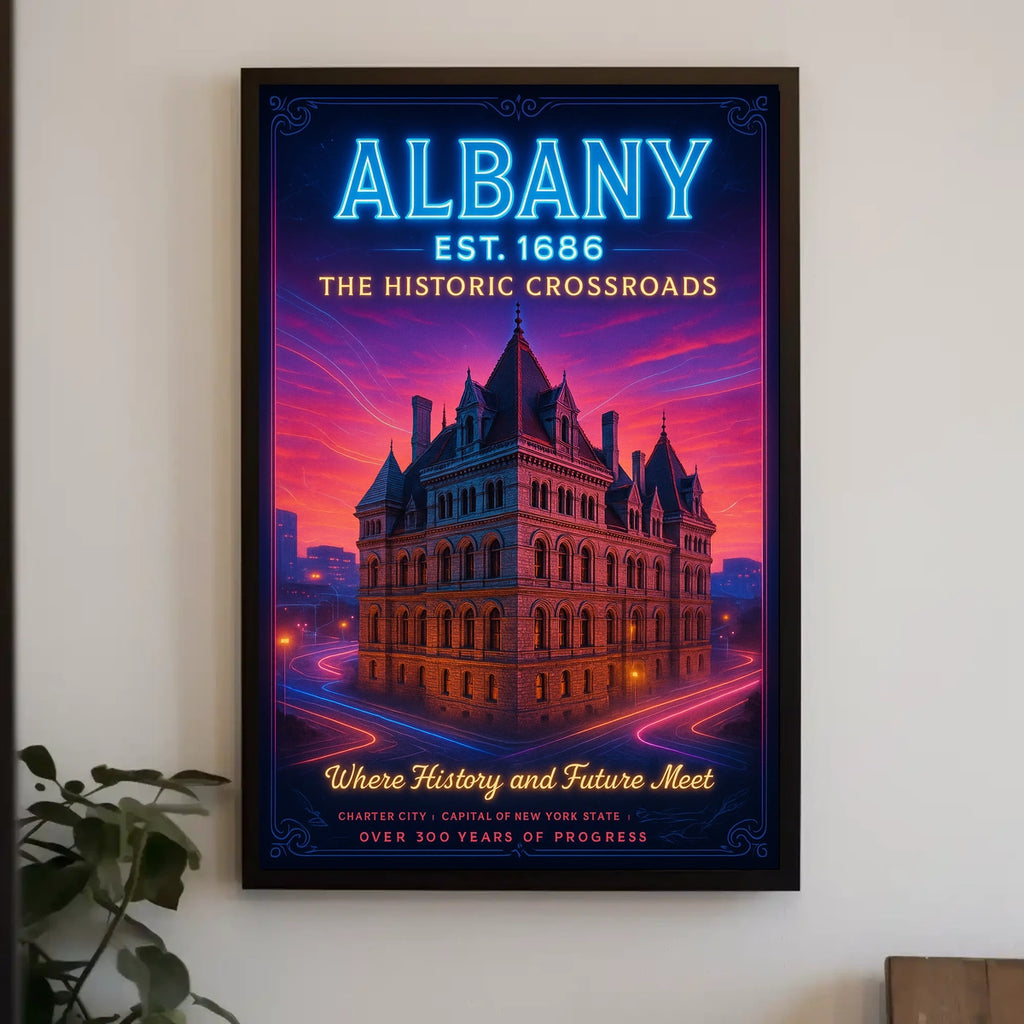 Embrace a bold tribute to Albany's architectural heritage with this vintage-modern poster. Ready to transform your space, it combines nostalgia with contemporary energy—perfect for home, office, or a curated gallery wall. Shop now and elevate your decor with a timeless, statement piece.