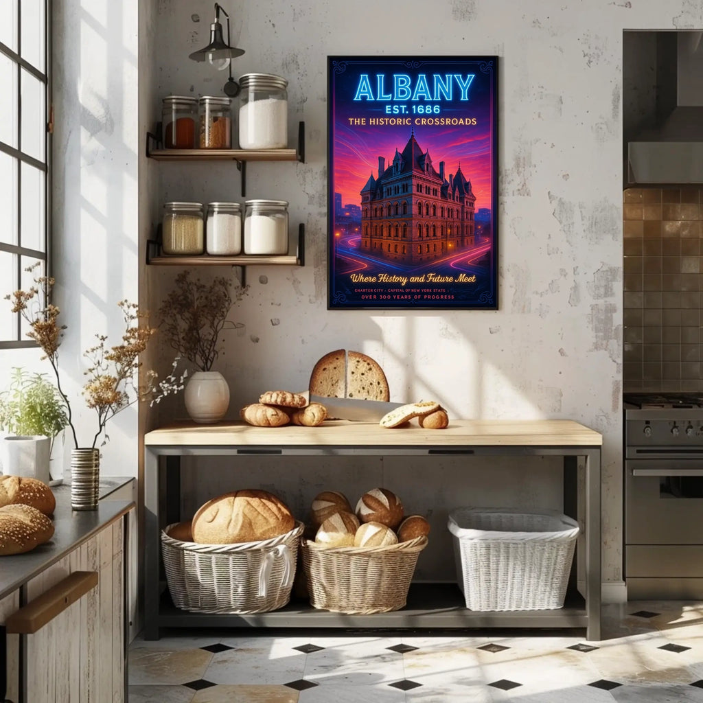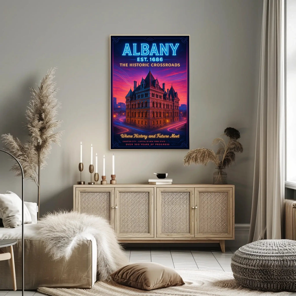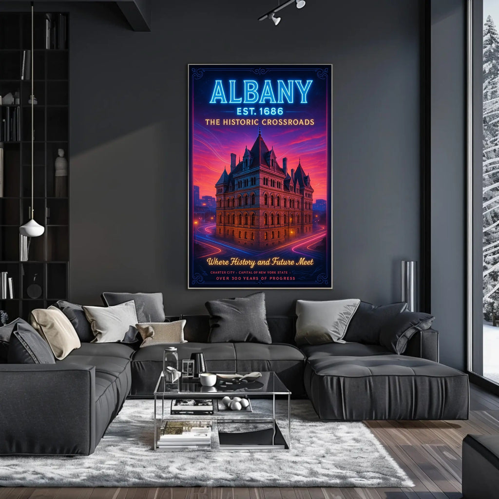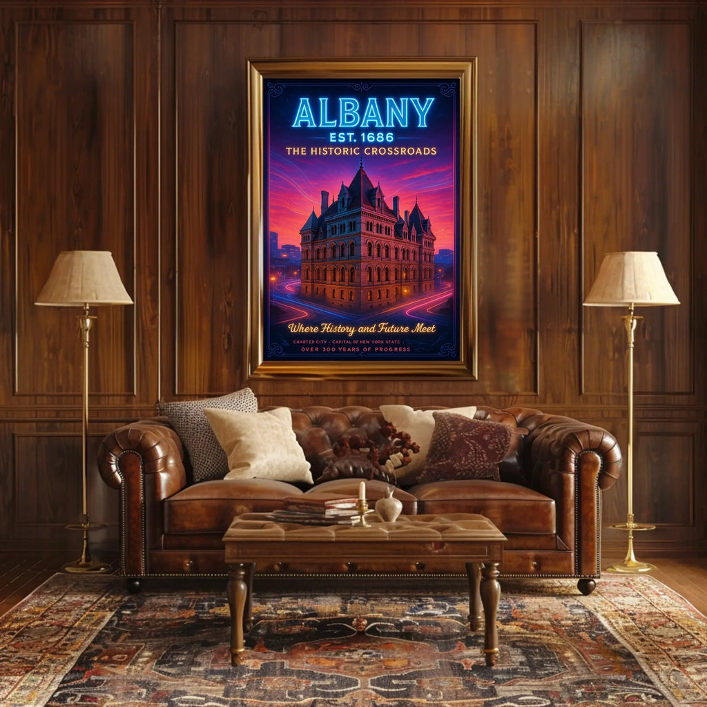 Embrace a bold tribute to Albany's architectural heritage with this vintage-modern poster. Ready to transform your space, it combines nostalgia with contemporary energy—perfect for home, office, or a curated gallery wall. Shop now and elevate your decor with a timeless, statement piece.