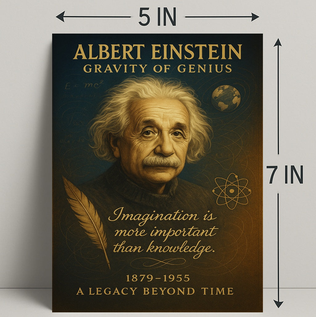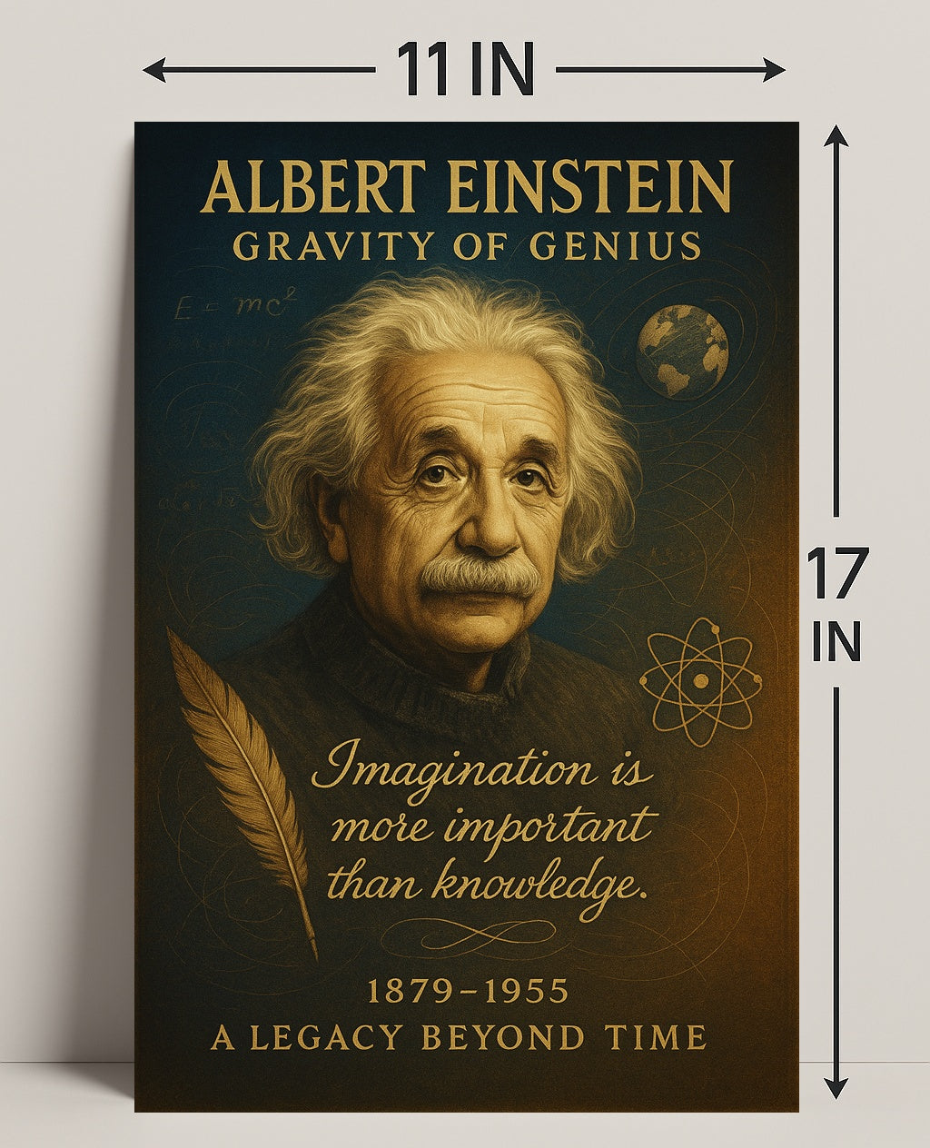 Albert Einstein — Gravity of Genius Poster from PosterGoat brings timeless inspiration to your walls with a richly detailed vintage-style portrait of one of history’s greatest minds. Warm gold typography and classic lettering set against a deep, textured background create an elegant focal point for any home office, study, classroom, or living space.