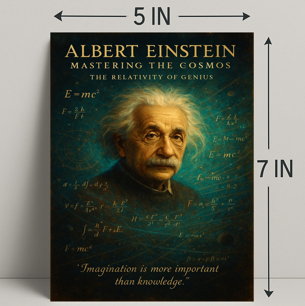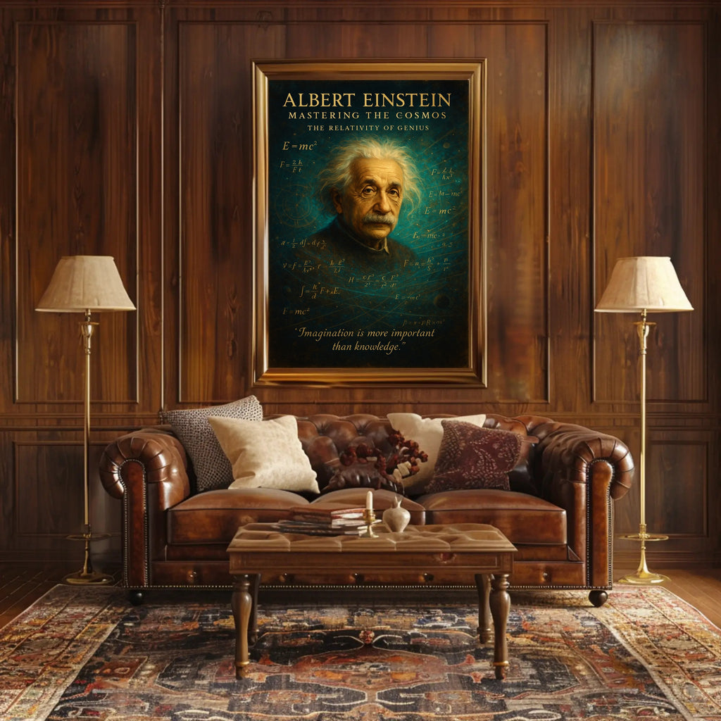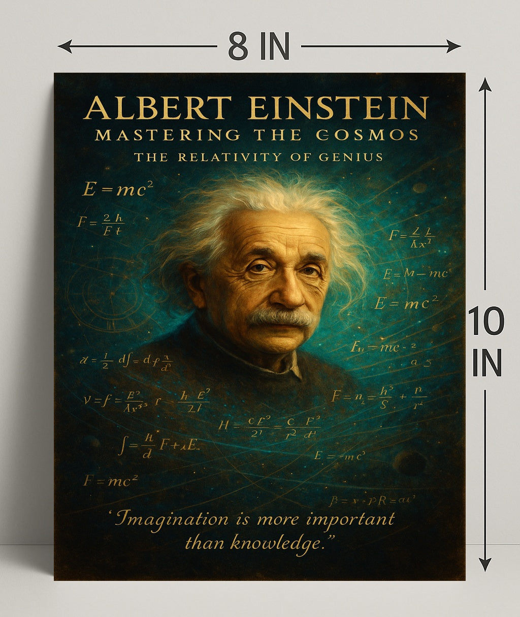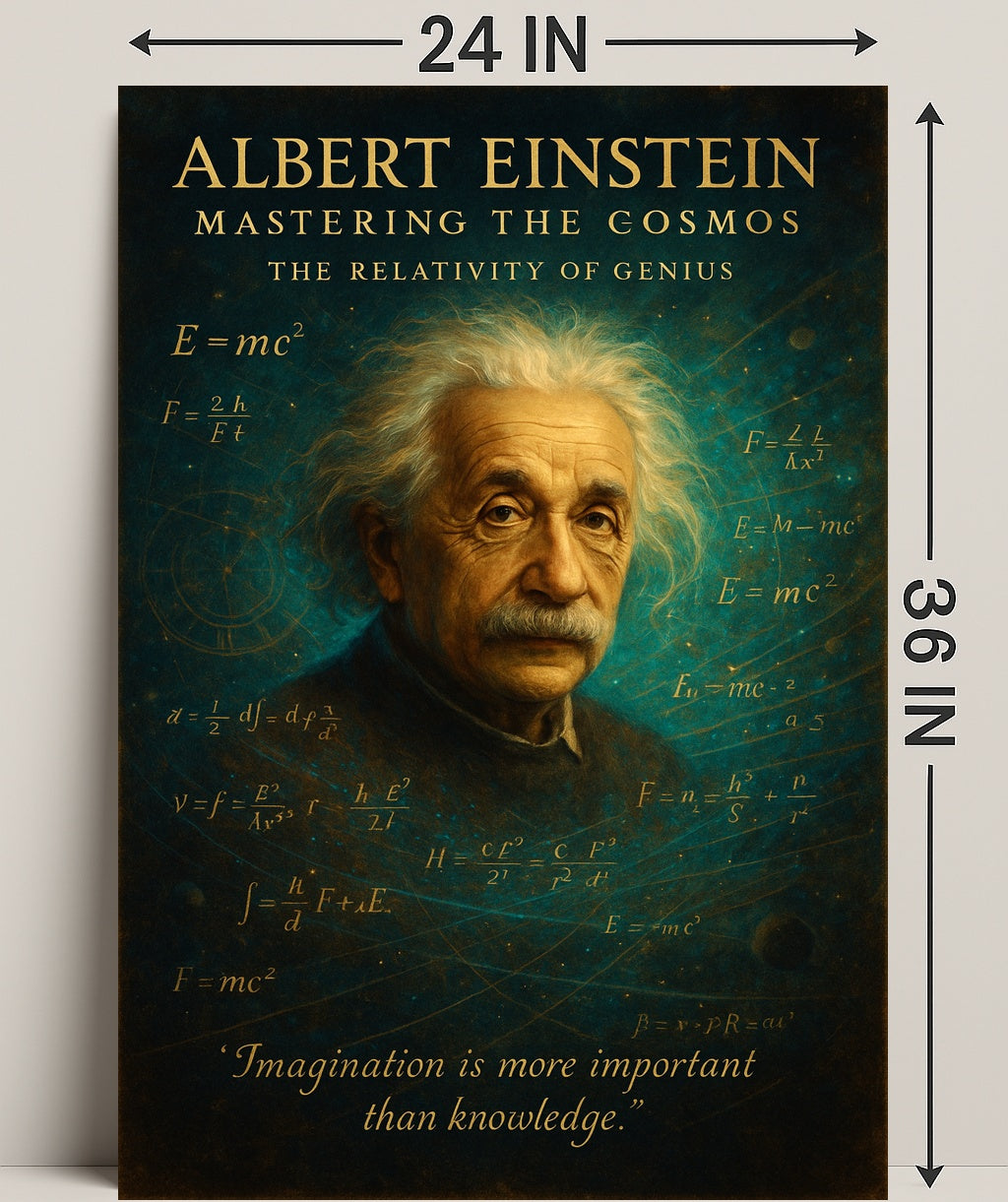 Bring the spirit of discovery to your walls with the Albert Einstein Mastering The Cosmos Poster from PosterGoat — a museum-quality art print that blends a classic portrait with cosmic teal and gold accents, handwritten equations, and the timeless quote: "Imagination is more important than knowledge."