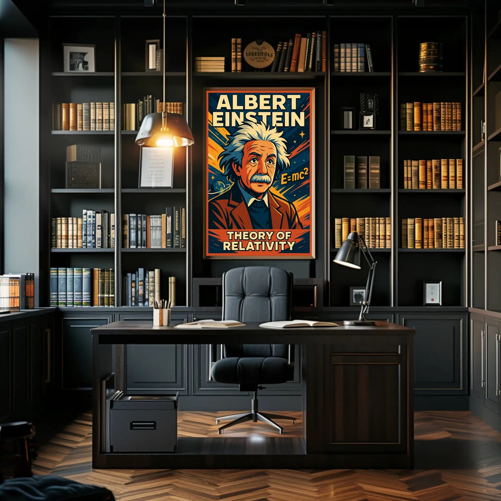 This poster captures the essence of Albert Einstein Theory of Relativity and merges scientific iconography with vintage scenic charm, making it a striking focal point for living spaces, classrooms, or offices.