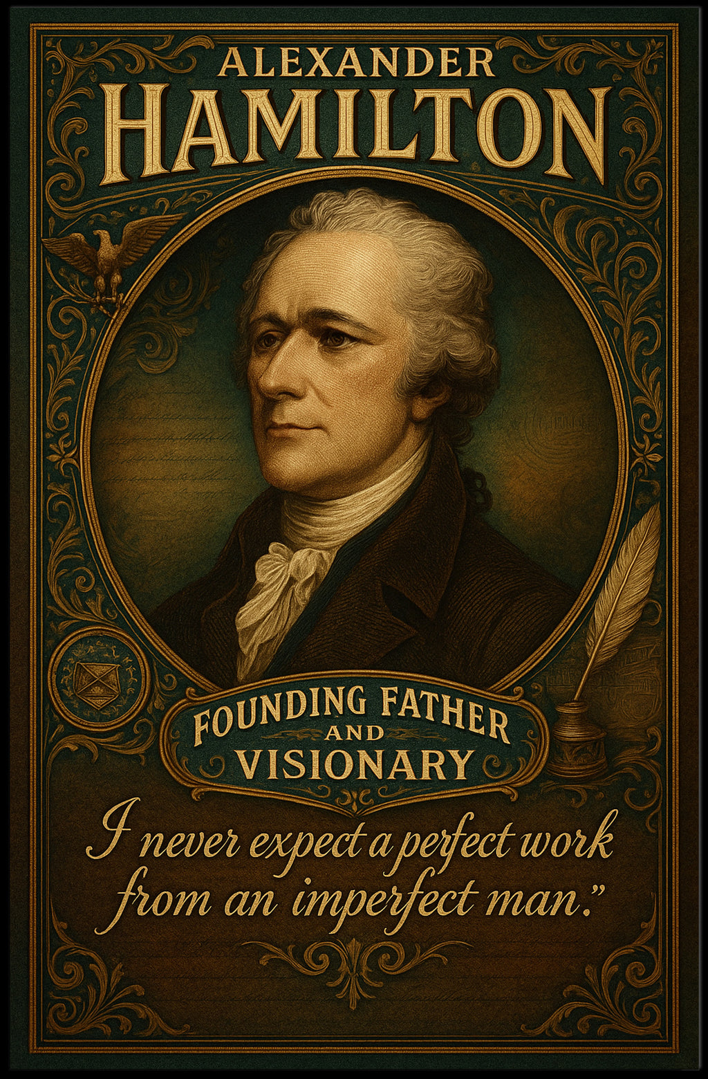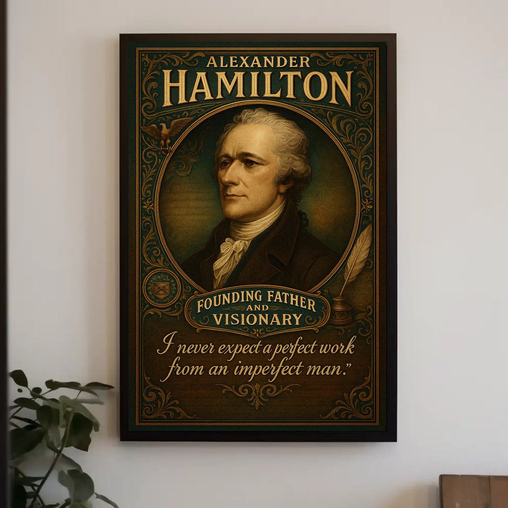 Historic portrait design: A finely rendered, museum-quality likeness of Alexander Hamilton framed by intricate scrollwork and an embossed-looking title that commands attention.