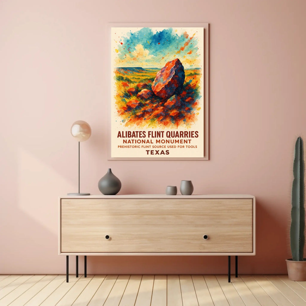 This poster celebrates Texas's geological and cultural heritage, featuring a colorful flint rock formation rendered in an impressionistic watercolor style that conveys fluidity and earthy tones. The design balances bold historical significance with tranquil natural beauty, making it a perfect homage for nature lovers and history enthusiasts alike.