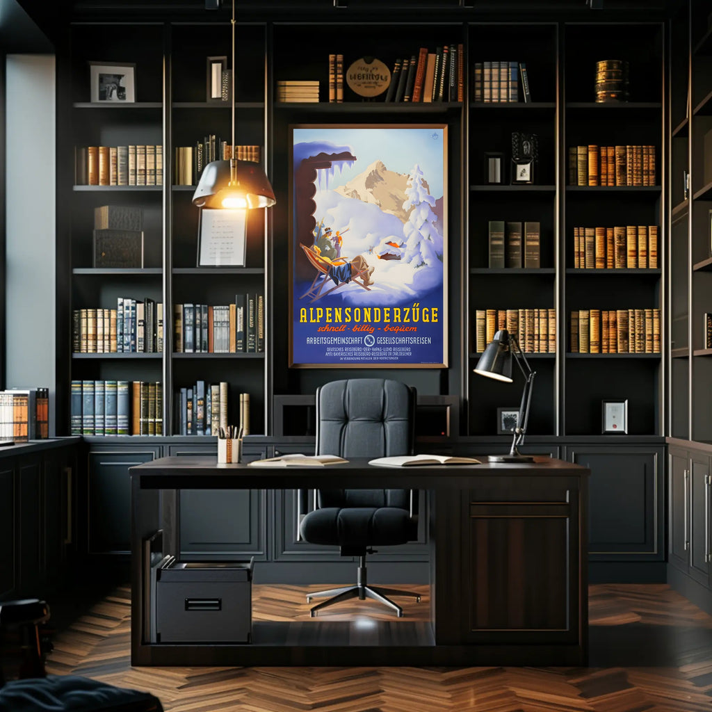 Why you’ll love it: This poster blends nostalgia and adventure — it evokes alpine train excursions, chalet relaxation, and snowy mountain leisure while doubling as a striking focal point for modern interiors. The illustrated scene invites viewers to pause, dream, and plan their next winter escape.