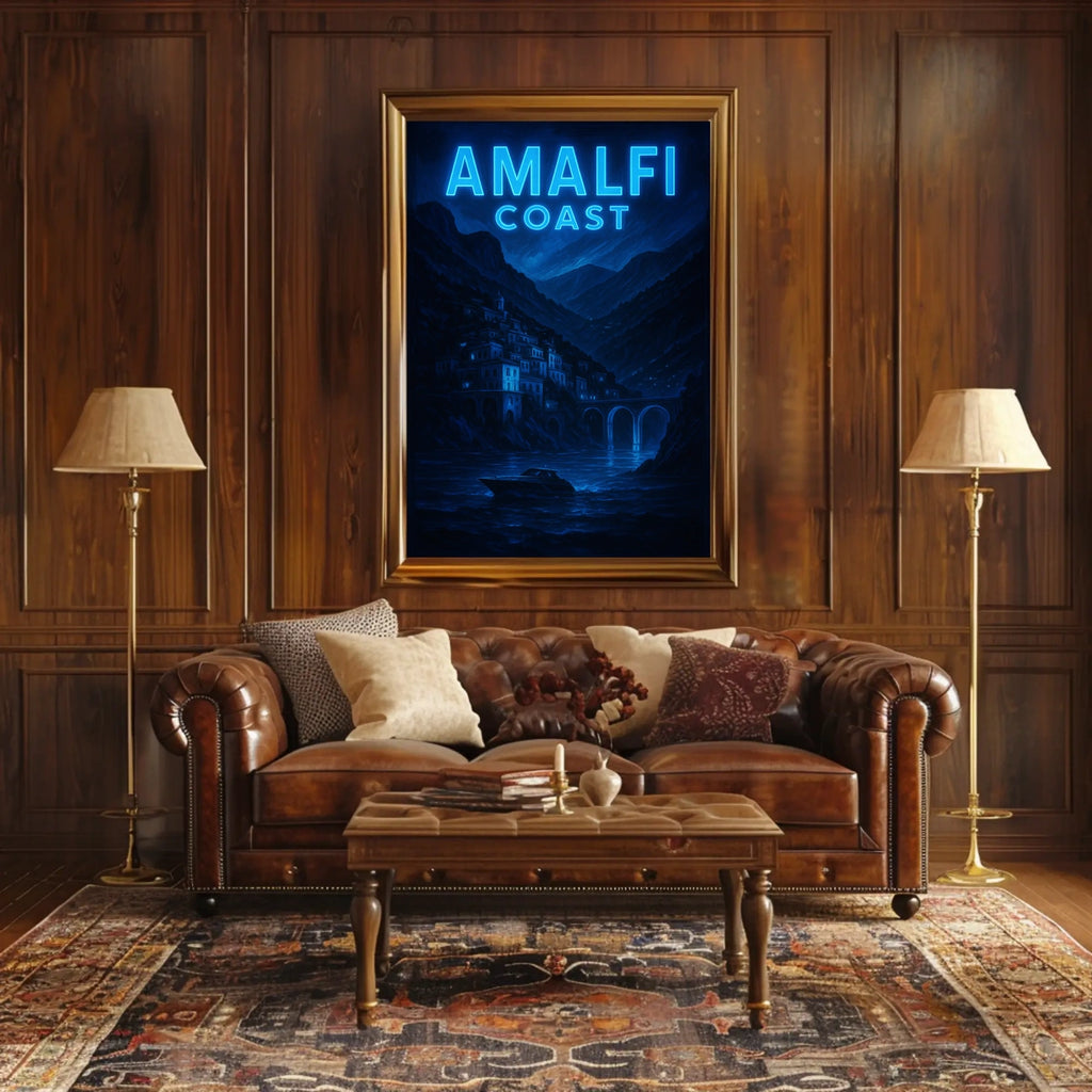 Bring a touch of the Amalfi coast into your space with this poster, whether hung in a living room, bedroom, study, or office. The serenity of the night scene complements modern and traditional decor, making it a versatile centerpiece or thoughtful gift for lovers of travel and coastal scenery.