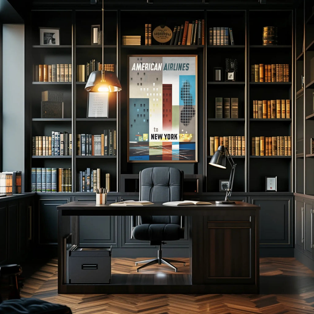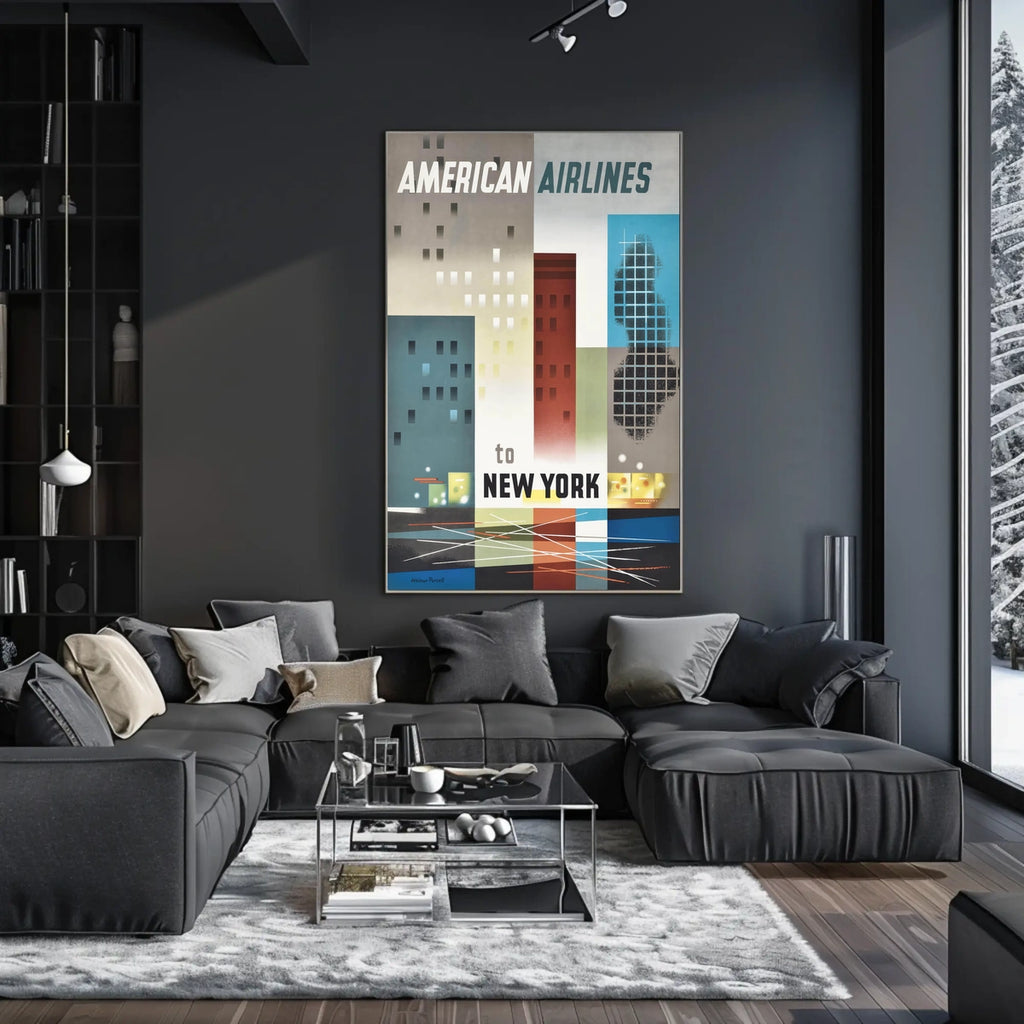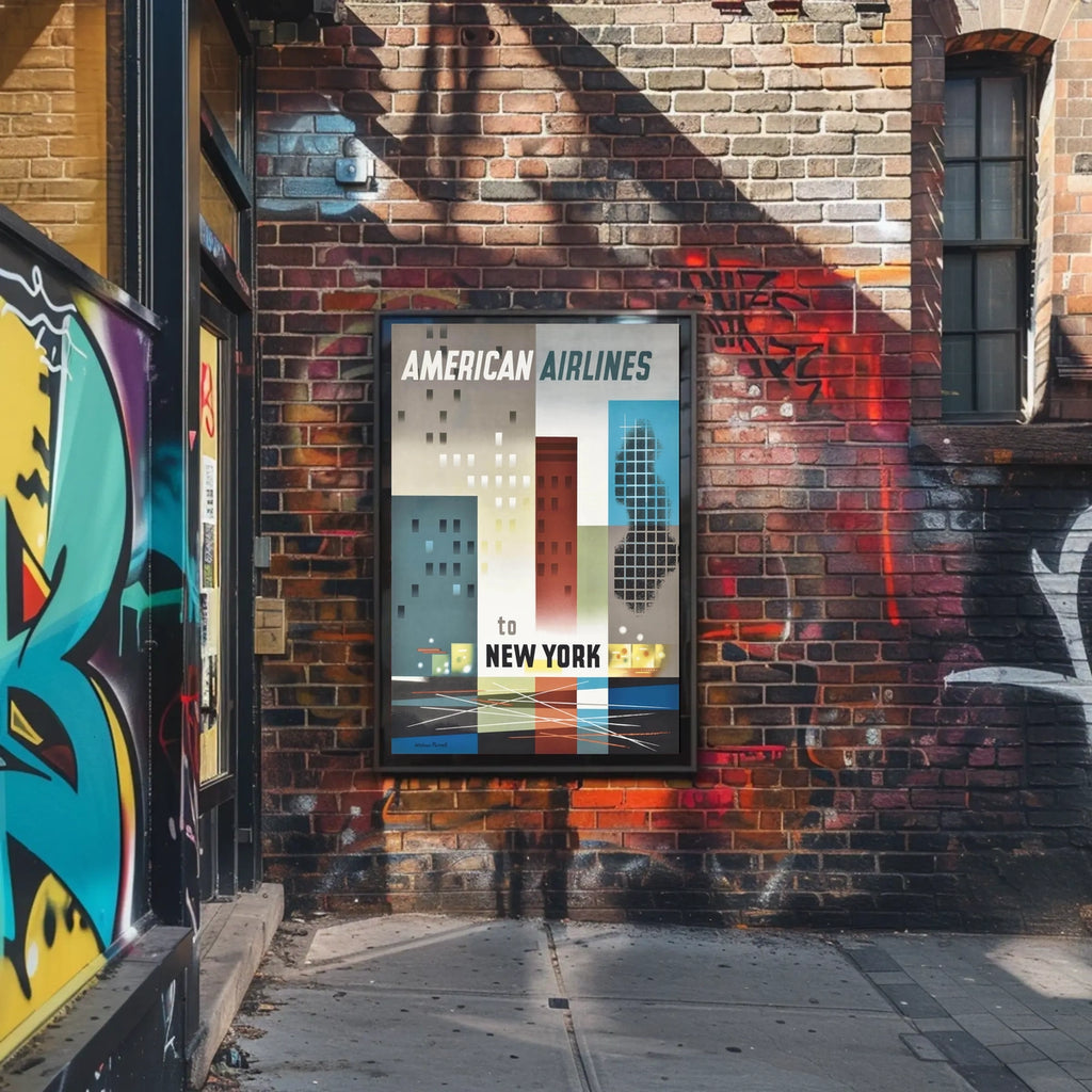 Step back to a golden era of air travel with this Vintage New York Travel Poster. Featuring an abstract, geometric cityscape and twinkling lights, it captures the energy of mid-20th-century routes and the lure of a bustling metropolis. A stylish accent for homes, studios, and offices alike.
