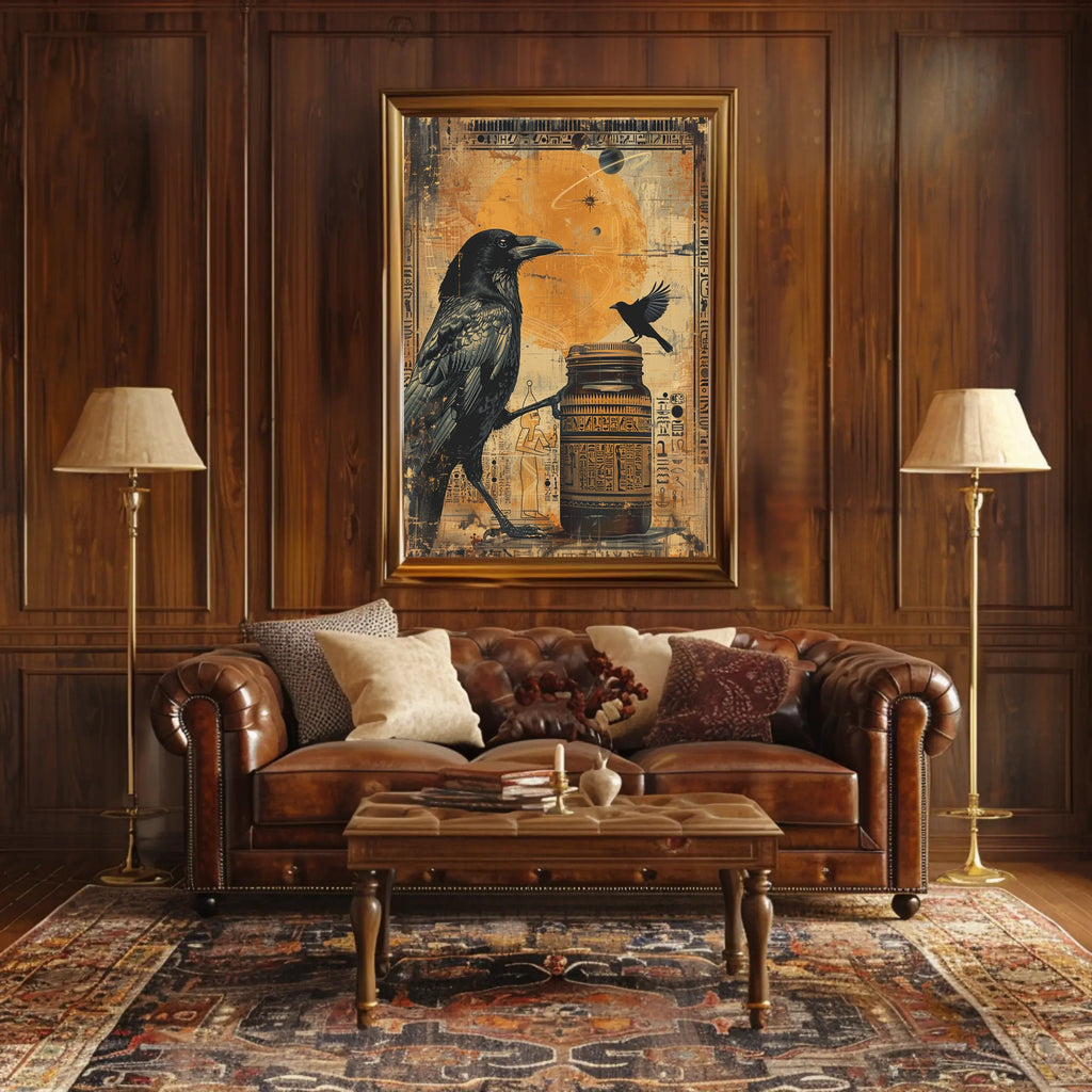 Evoke the mystery of ancient Egypt with the Ancient Egyptian Cosmic Symbols Artistic Poster from PosterGoat — a cinematic wall art piece that fuses hieroglyphic tradition with cosmic imagery. This 18x24 poster features a detailed raven and a companion bird poised over a carved jar, layered against a distressed, earthy-orange celestial disk and orbiting planets, creating a dramatic focal point for any room.