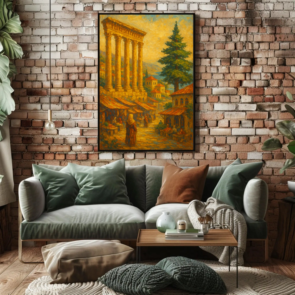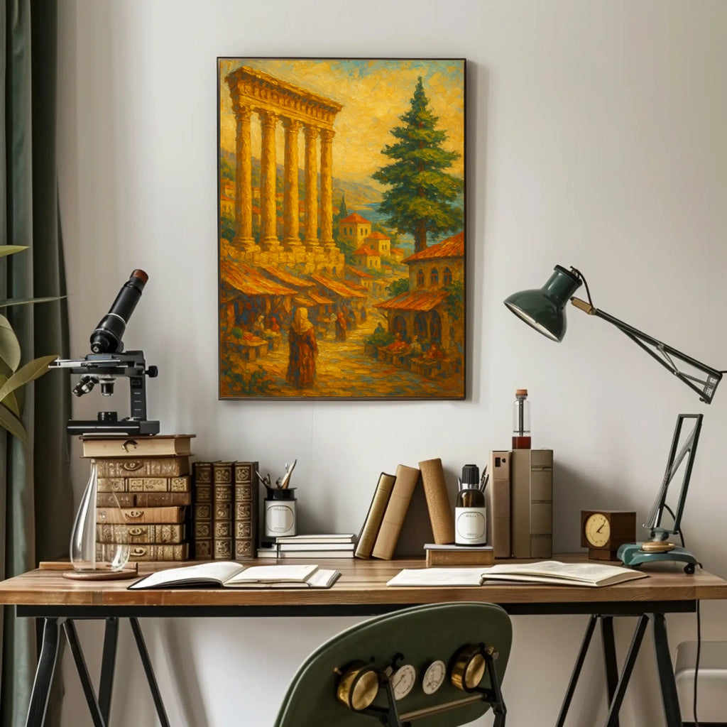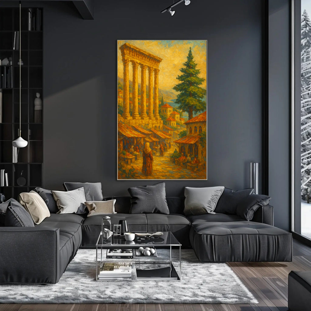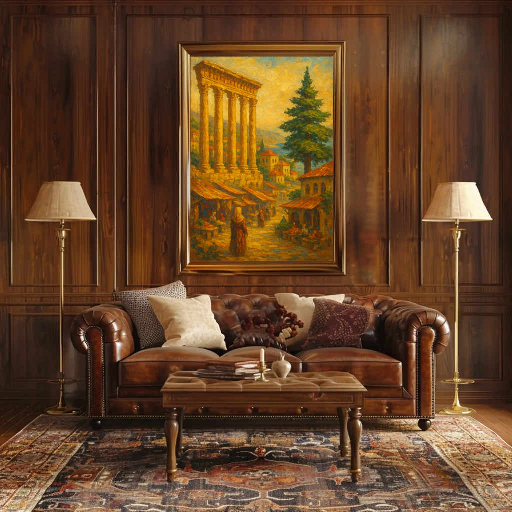 Step into a vibrant scene of a bustling Mediterranean market set against majestic ancient ruins. This artwork captures the essence of a bygone era with warm, golden hues, lively energy, and a charming village backdrop that invites daily inspiration and cultural reflection.