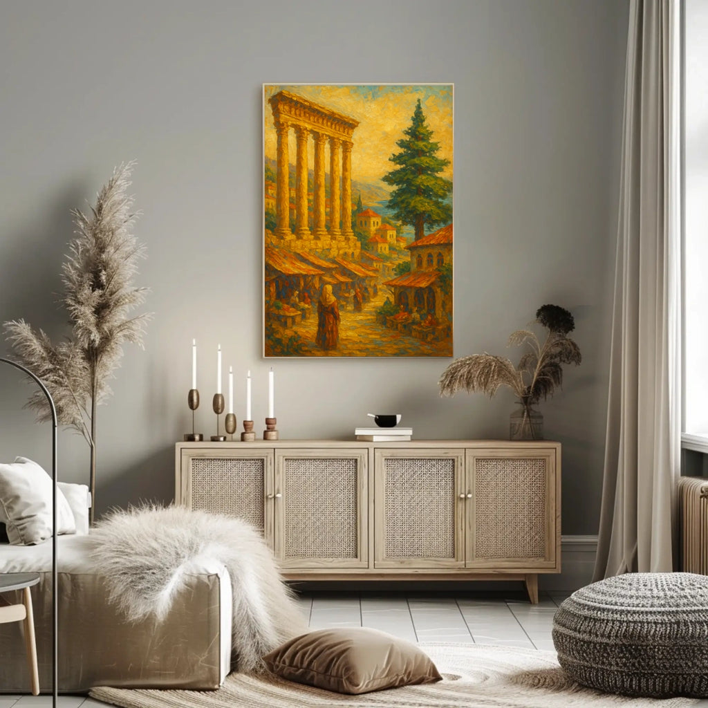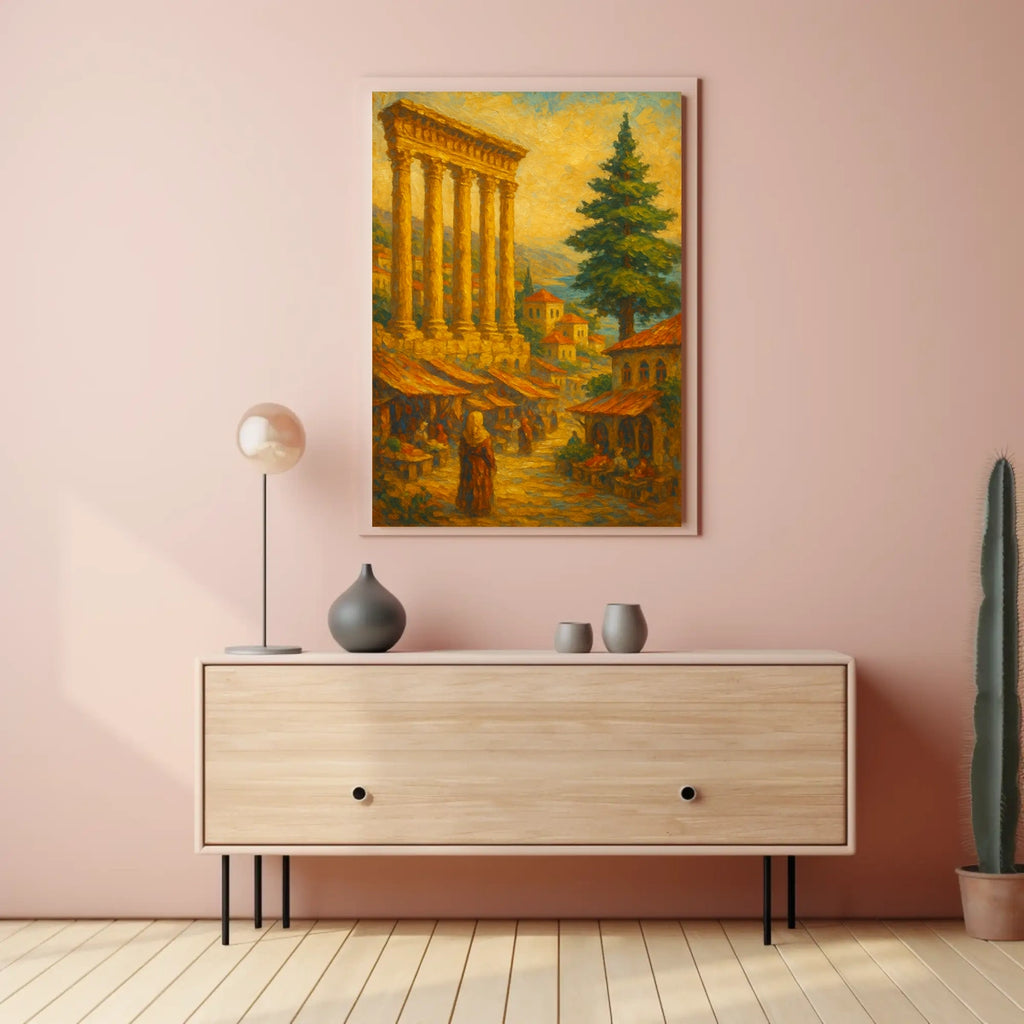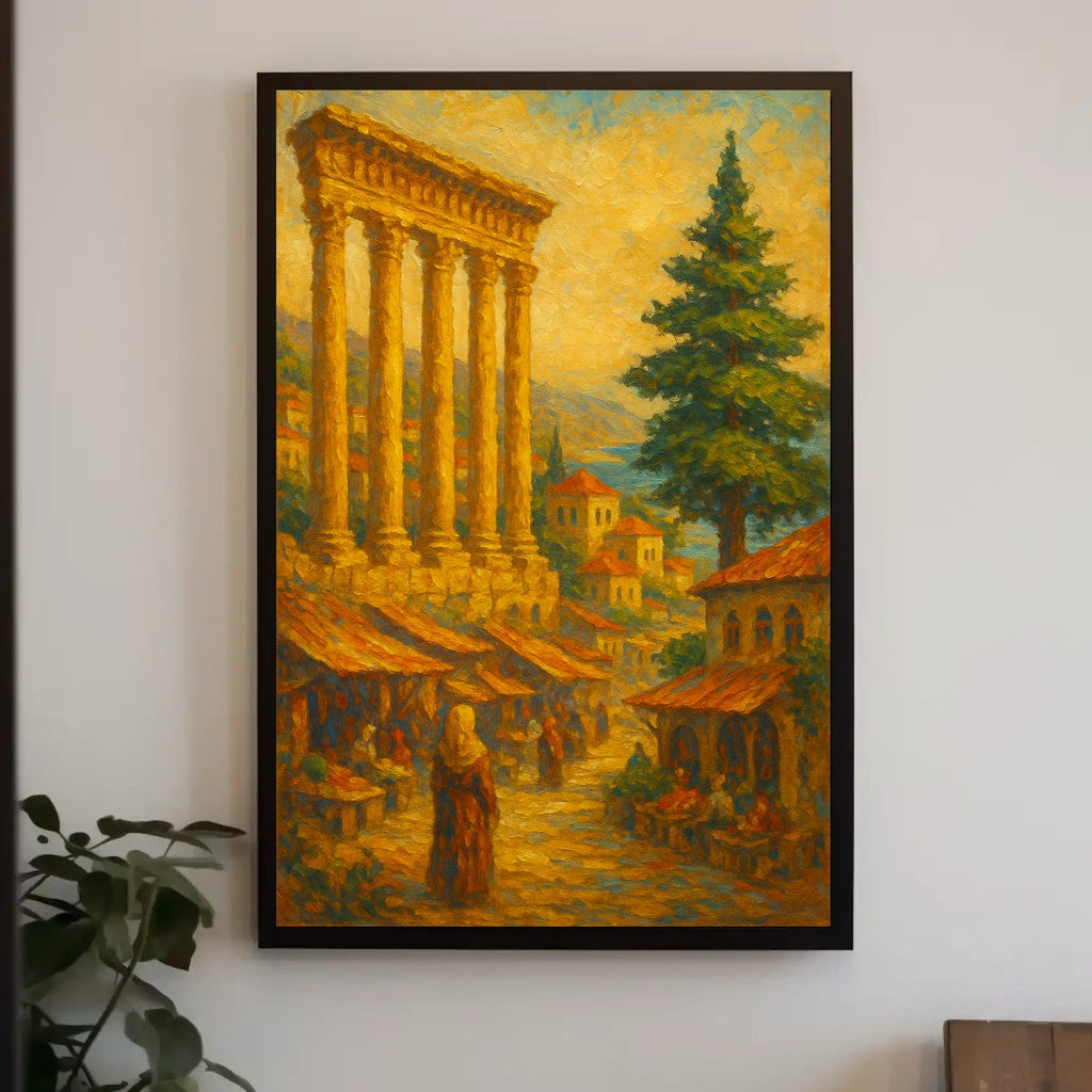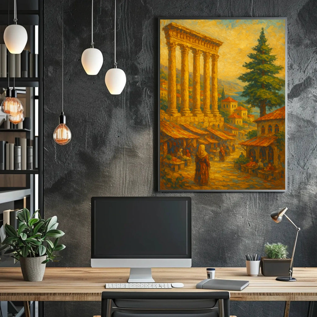 Step into a vibrant scene of a bustling Mediterranean market set against majestic ancient ruins. This artwork captures the essence of a bygone era with warm, golden hues, lively energy, and a charming village backdrop that invites daily inspiration and cultural reflection.