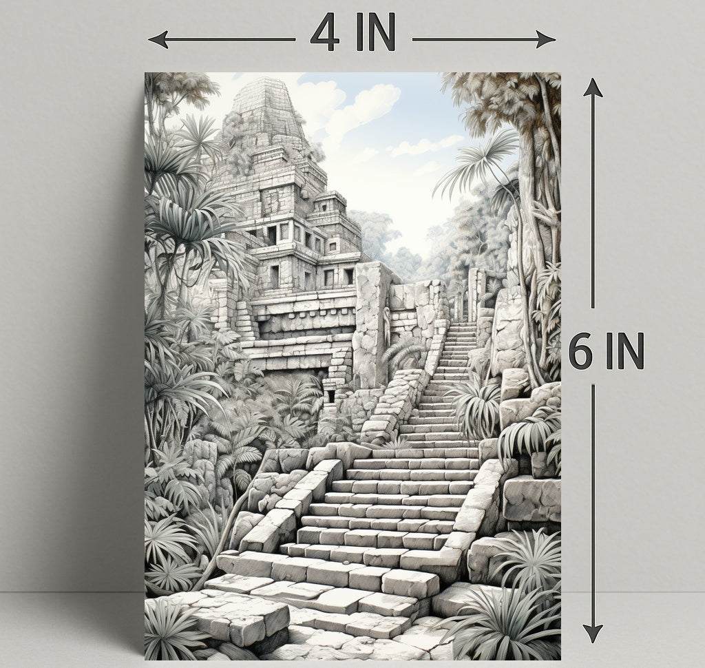 Photorealistic pencil-style illustration: Intricate linework and shading emphasize the weathered stone blocks, carved architectural details and layered stairways, creating depth and texture that draws the eye.