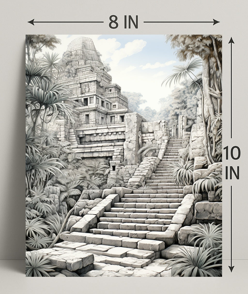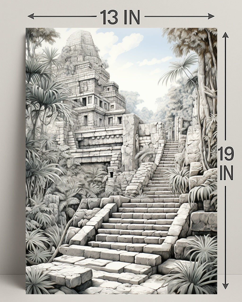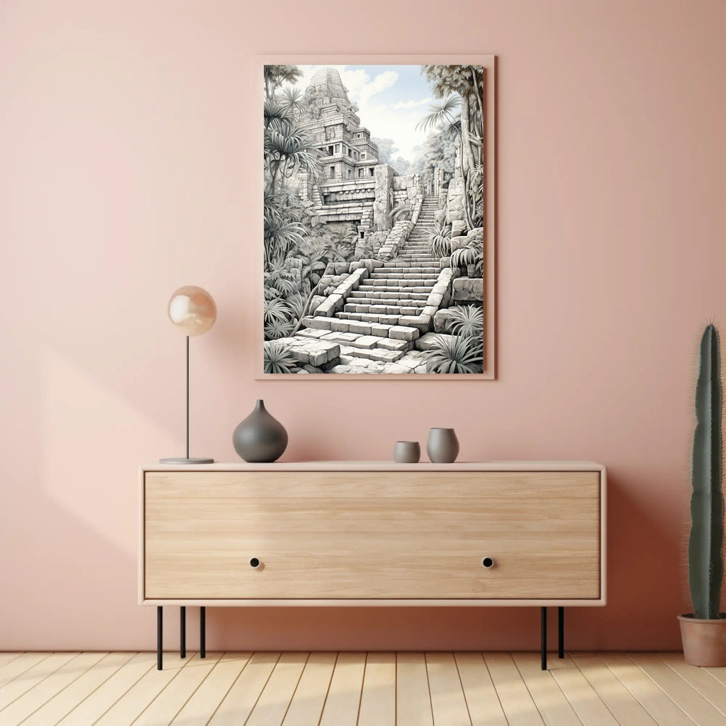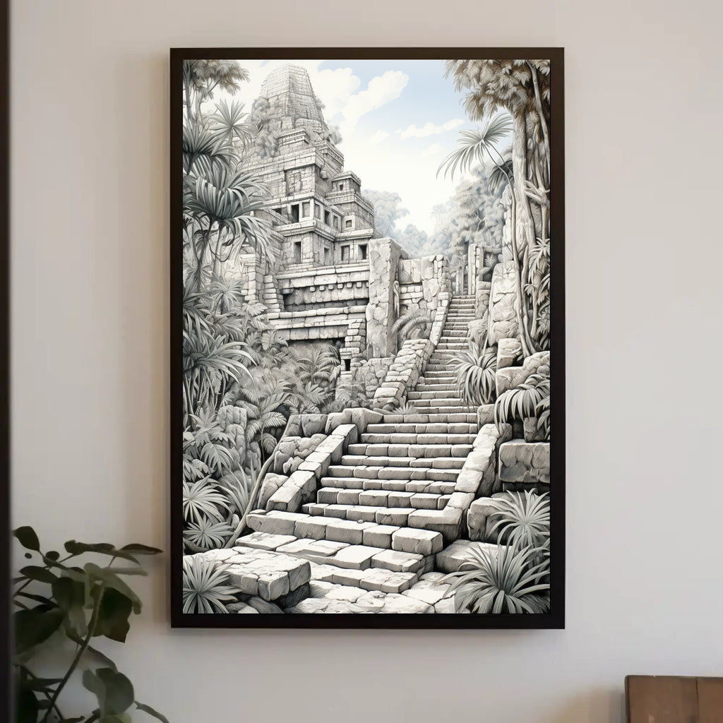 Bring a lost world into your home with the Ancient Temple In The Jungle Poster from PosterGoat — a striking, minimalist artwork that captures the quiet majesty of an overgrown temple, winding stone steps and dense tropical foliage rendered in finely detailed monochrome with a soft sky wash.