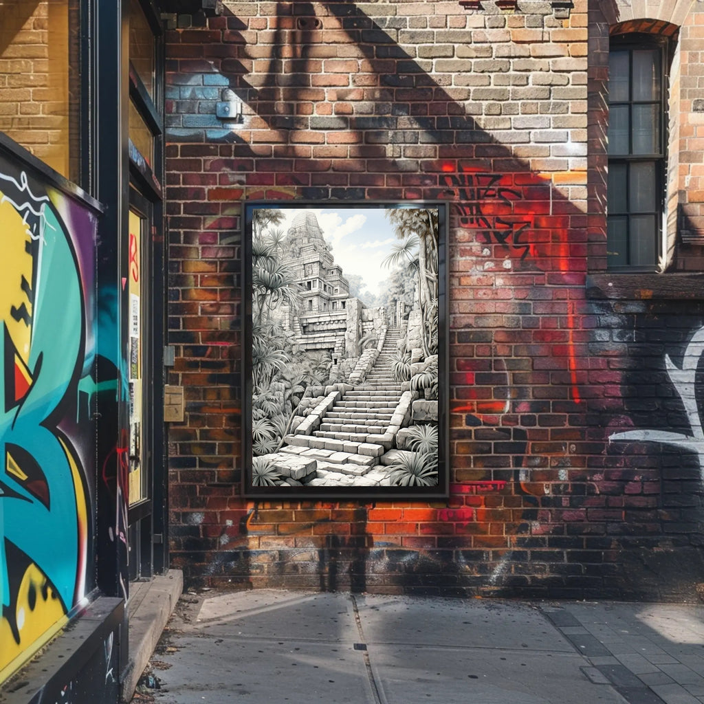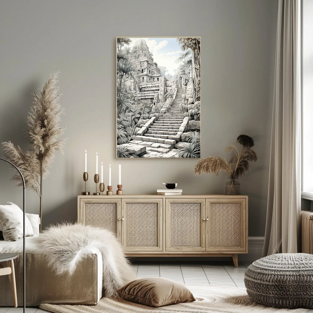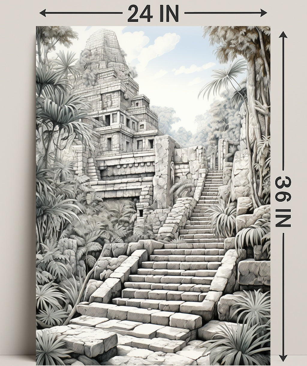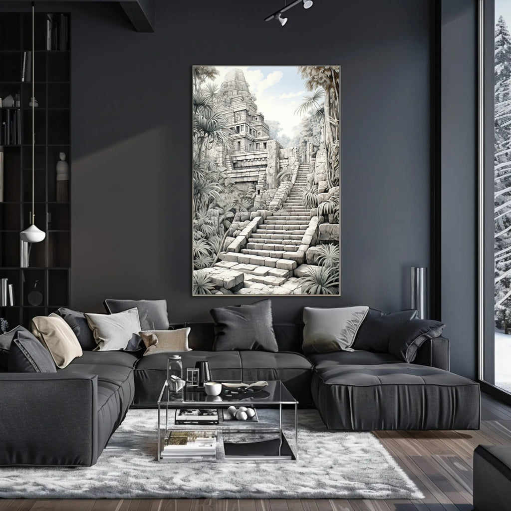 Bring a lost world into your home with the Ancient Temple In The Jungle Poster from PosterGoat — a striking, minimalist artwork that captures the quiet majesty of an overgrown temple, winding stone steps and dense tropical foliage rendered in finely detailed monochrome with a soft sky wash.
