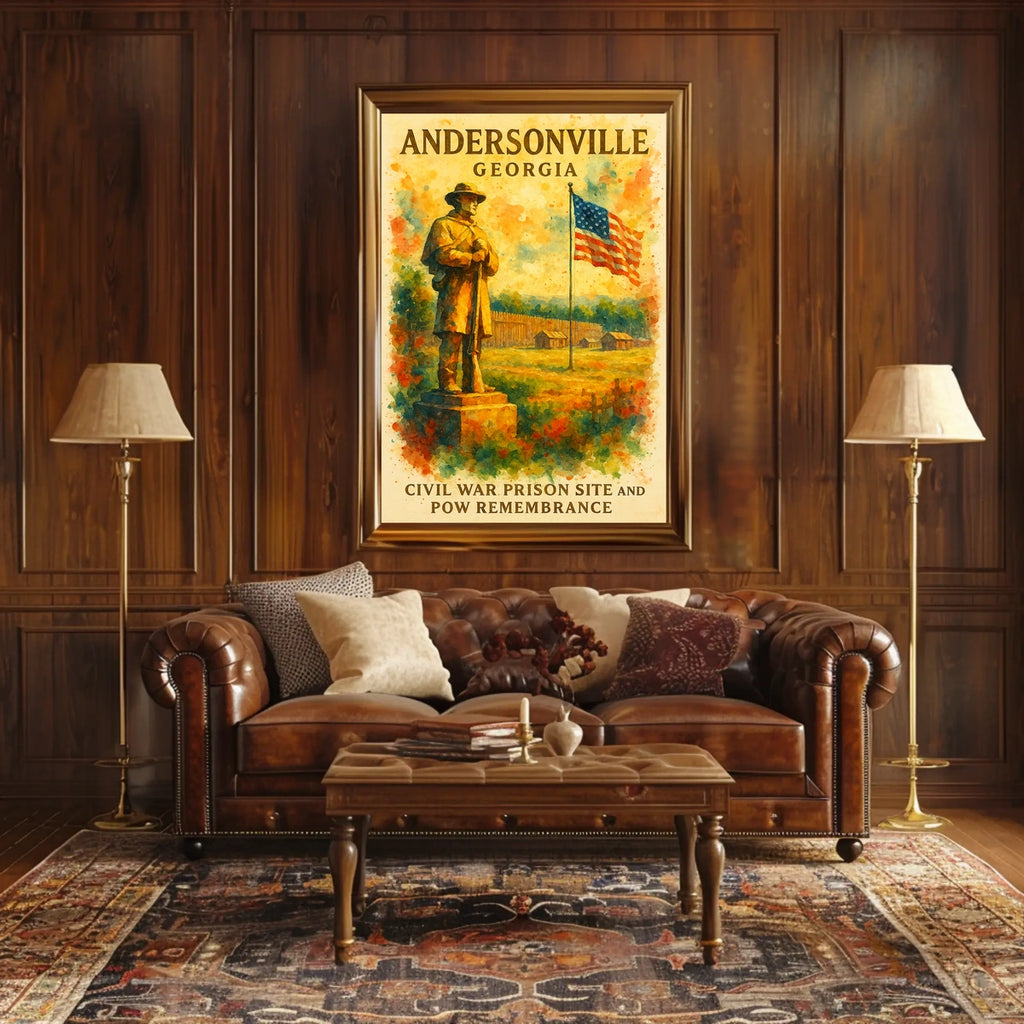 Immerse yourself in the poignant history of Andersonville, Georgia, with this Andersonville Civil War Prison Remembrance Poster Print. This evocative Civil War poster captures the solemnity of a prisoner-of-war camp, portraying a statue of a soldier beside a waving American flag, set against a backdrop of a wooden stockade. Rendered in a vintage watercolor style, the soft, blended colors and textured appearance evoke historical reverence and nostalgia.