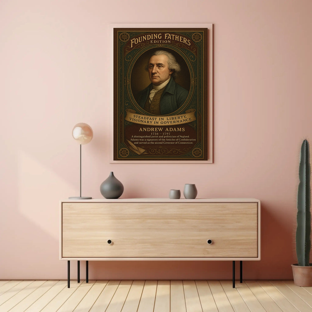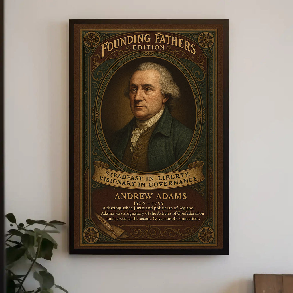 Bring historical gravitas and vintage charm to your walls with the Andrew Adams Founding Fathers Edition Poster from PosterGoat. This richly detailed art print features a dignified portrait set inside an ornate oval frame, filigree borders and a classic banner proclaiming “Steadfast in Liberty, Visionary in Governance” — a perfect centerpiece for living rooms, offices, study nooks, or gallery-style décor.