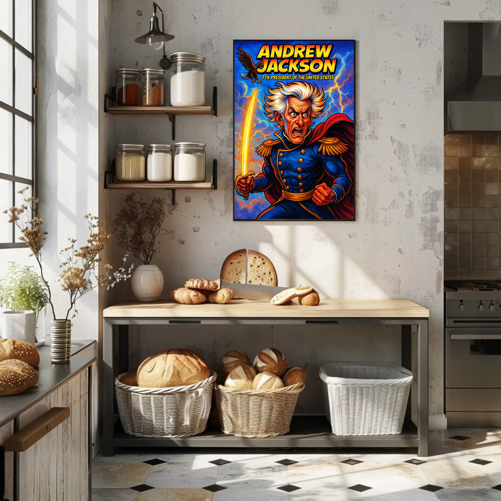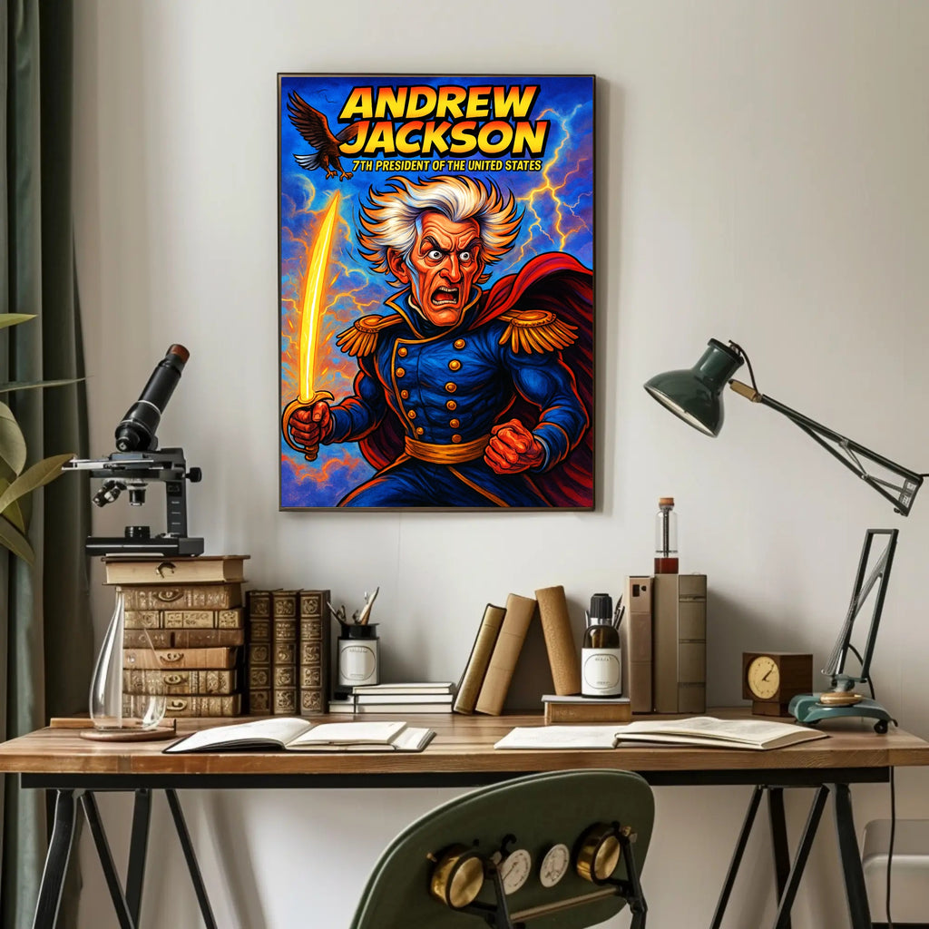 Andrew Jackson 7th President Poster — a bold, collectible art print from PosterGoat that reimagines America's 7th president in an intense, comic-inspired portrait. Electric colors, dynamic brushwork and dramatic lightning set a heroic scene: Jackson grips a glowing saber, cape billowing, eyes wide with resolve — a statement piece that brings energy and conversation to any room.
