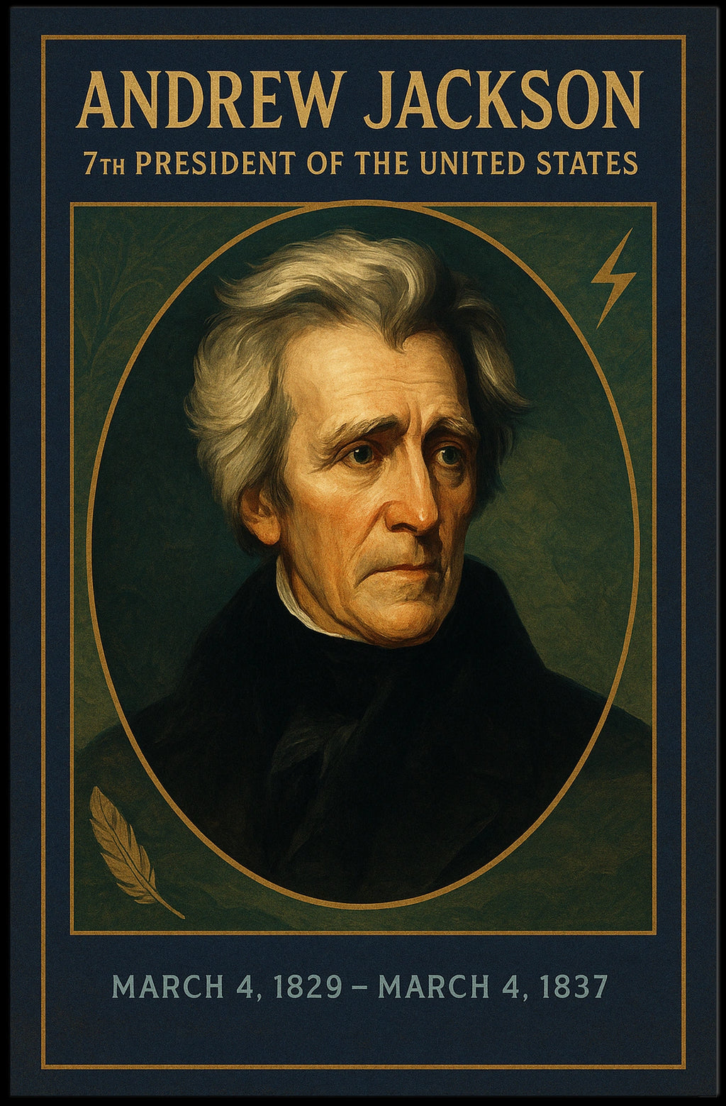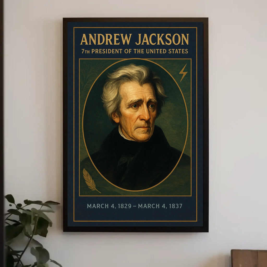 This educational poster honors Andrew Jackson, the 7th President of the United States, highlighting the era of democracy expansion and his enduring presidential legacy. It’s crafted for history lovers, students, and classroom displays that want a striking, informative centerpiece.