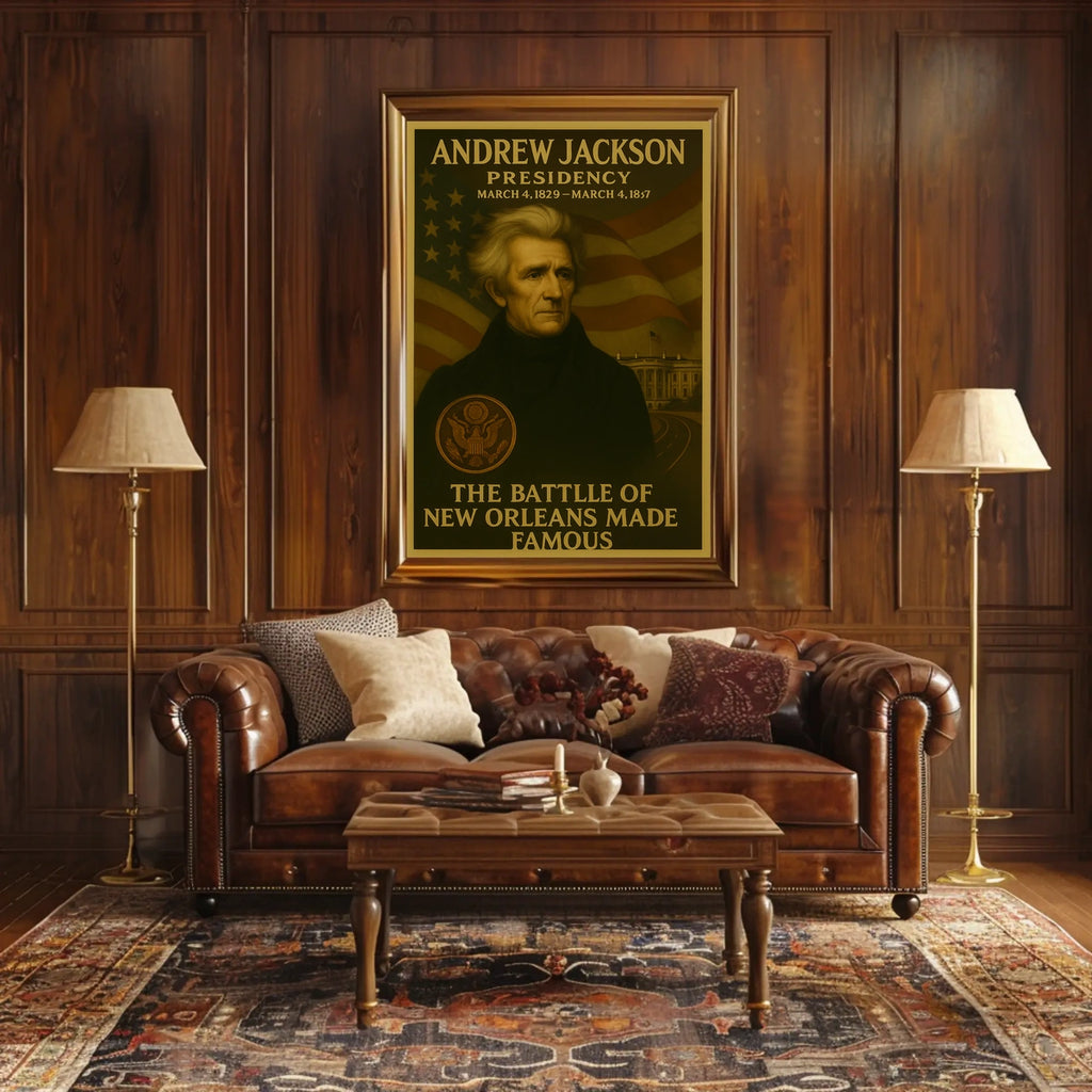 Step back into early American history with our expertly crafted Andrew Jackson poster. Celebrating the dynamic and transformational period of his presidency, this artwork shines a spotlight on his significant legacy, from his leadership in the Battle of New Orleans to his strategic role in shaping the nation. The poster's intricate design merges classical artistic styles with historical elements to create a thought-provoking and striking visual piece. Perfect for history enthusiasts or educational spaces, this poster not only enhances your understanding of Andrew Jackson's presidency but also brings a sophisticated, vintage charm to any environment.
