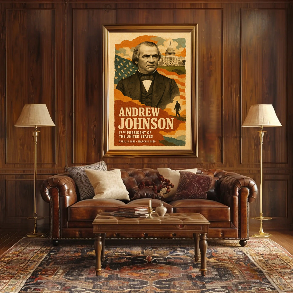 Celebrate American history with a striking layered digital collage poster featuring Andrew Johnson, the 17th President of the United States. Designed for history fans, educators, and lovers of patriotic wall art, this piece blends vintage flair with contemporary collage artistry to ignite conversation in any space.