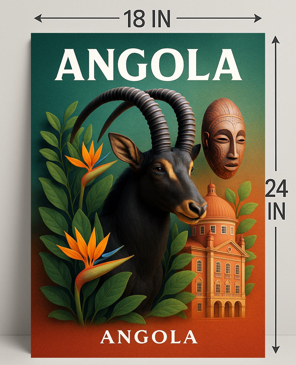 Bring the spirit of Angola into your home with the "Angola — A Cultural Mosaic" poster by PosterGoat. This richly illustrated art print blends wildlife, architecture and traditional motifs into a vintage-collage style composition that commands attention — a perfect centerpiece for living rooms, offices, or travel-inspired galleries.