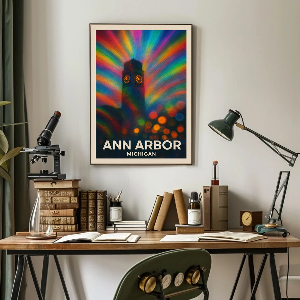 Celebrate the vibrant spirit of Ann Arbor with this stunning poster featuring the city's iconic clock tower. Bathed in radiant rainbow-colored beams, the tower stands as a beacon of local pride and wonder. The modern, abstract style captures a lively nighttime cityscape, filled with dynamic shapes and bold colors. This artwork's dreamy, surreal feel evokes a sense of celebration and optimism, making it a perfect addition to any space seeking energy and vibrancy. Ideal for art lovers, city enthusiasts, or anyone looking to bring a touch of Ann Arbor's magic into their home.