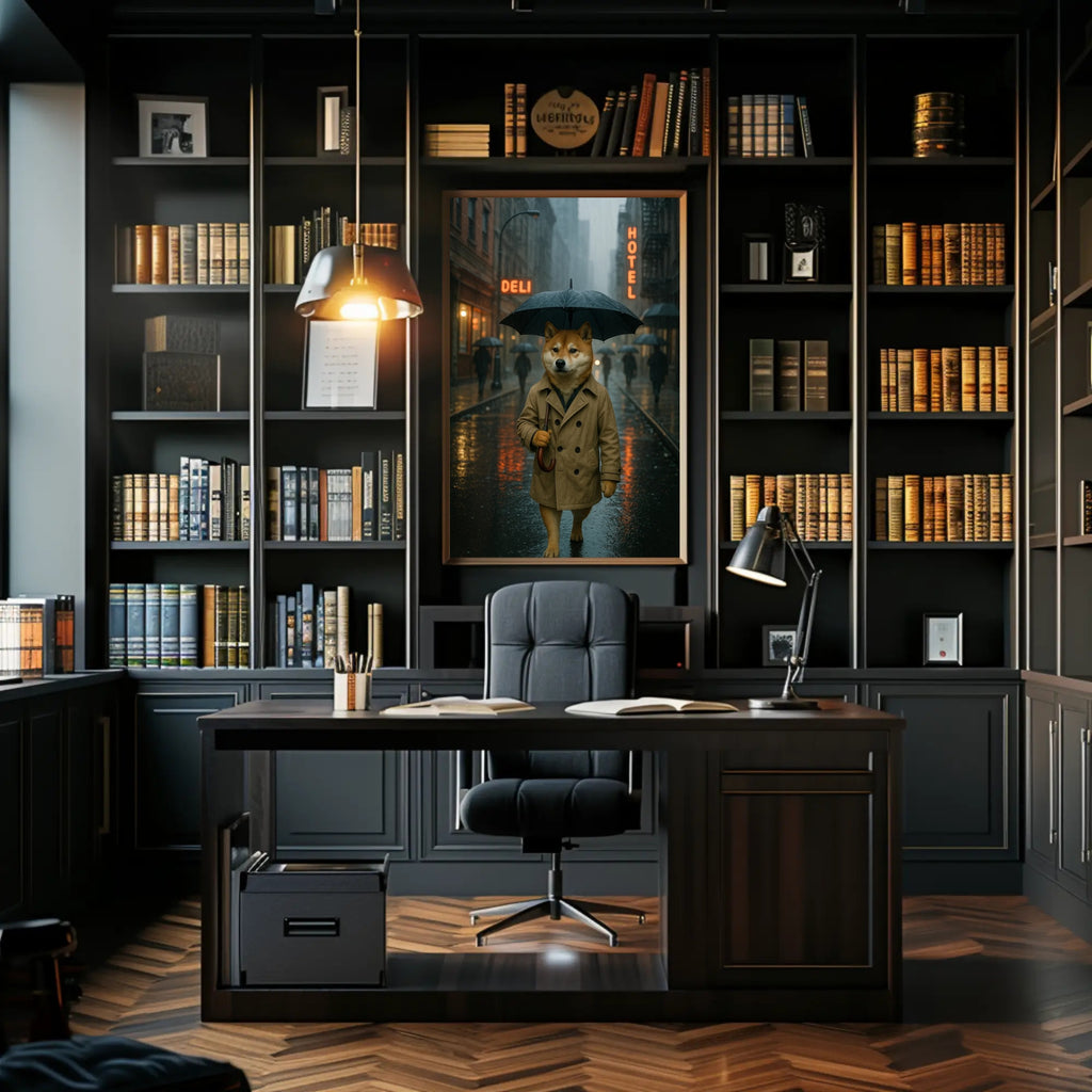 Bring a touch of surreal nostalgia to your walls with this Anthropomorphic Shiba Inu in Urban Cityscape Art Poster from PosterGoat. This imaginative poster captures a dignified Shiba Inu dressed in a classic trench coat, holding a curved-hand umbrella as neon "DELI" and "HOTEL" signs glow through a misty, rain-slicked mid-20th-century street. Moody lighting, cinematic reflections, and finely detailed textures make this piece an instant conversation starter for any home or office.