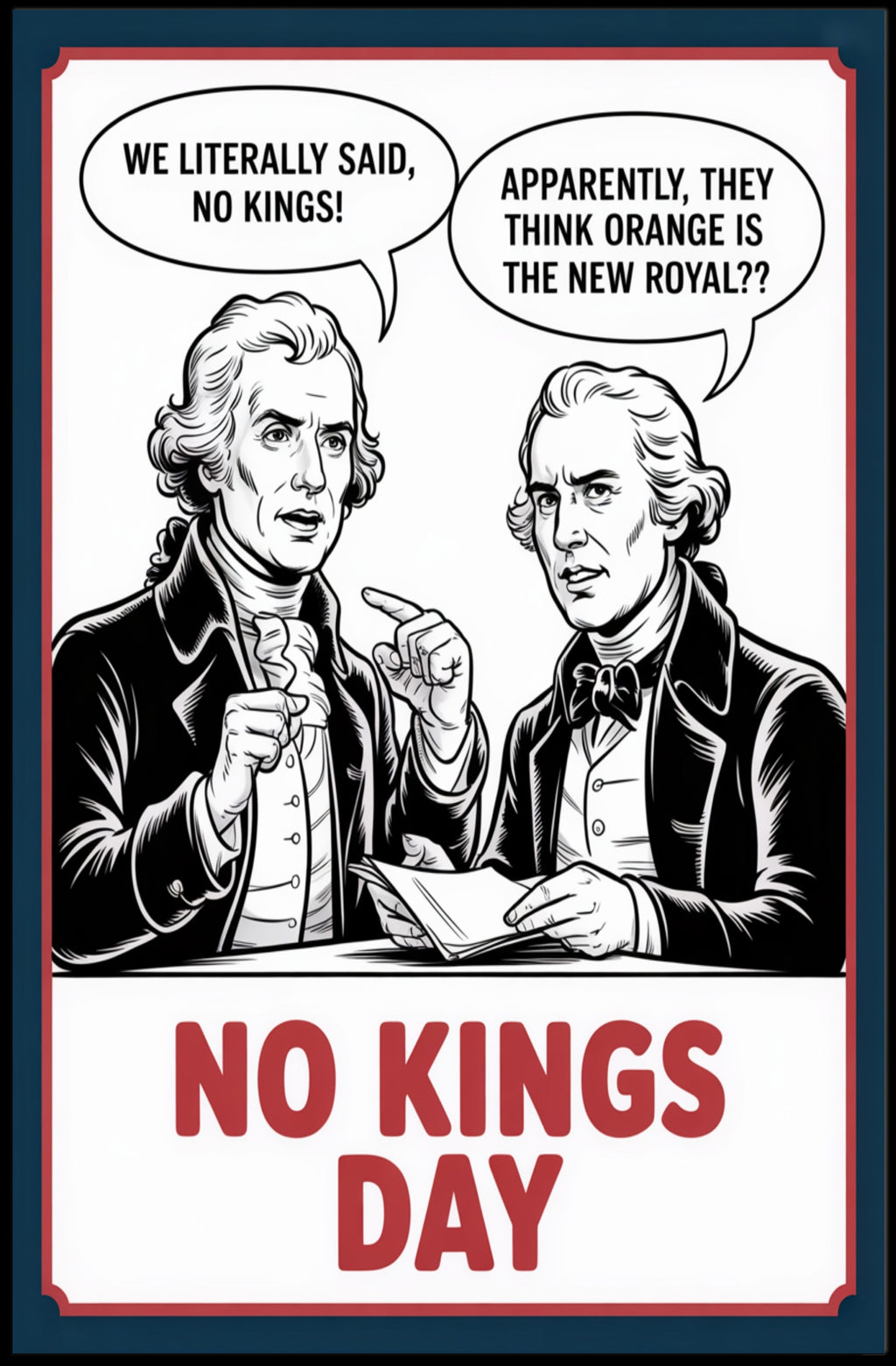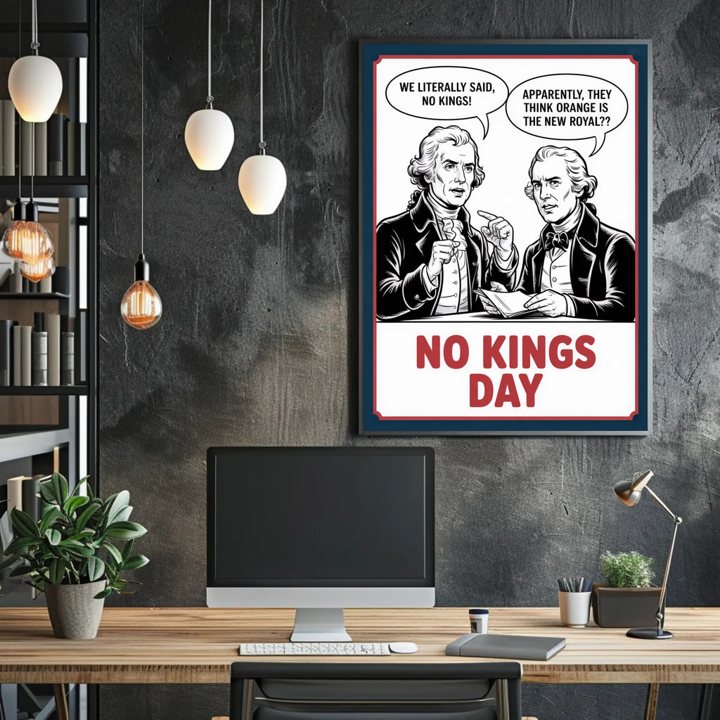 Anti-Monarchy Political Satire with Founding Fathers Poster from PosterGoat puts sharp political humor and historic critique on your wall. This bold black-and-white illustration—featuring two 18th-century figures in Founding Fathers attire with speech bubbles and crisp line art—makes a witty, conversation-starting statement about power and independence. Ideal for history enthusiasts, fans of political satire, and anyone who loves modern-vintage decor.