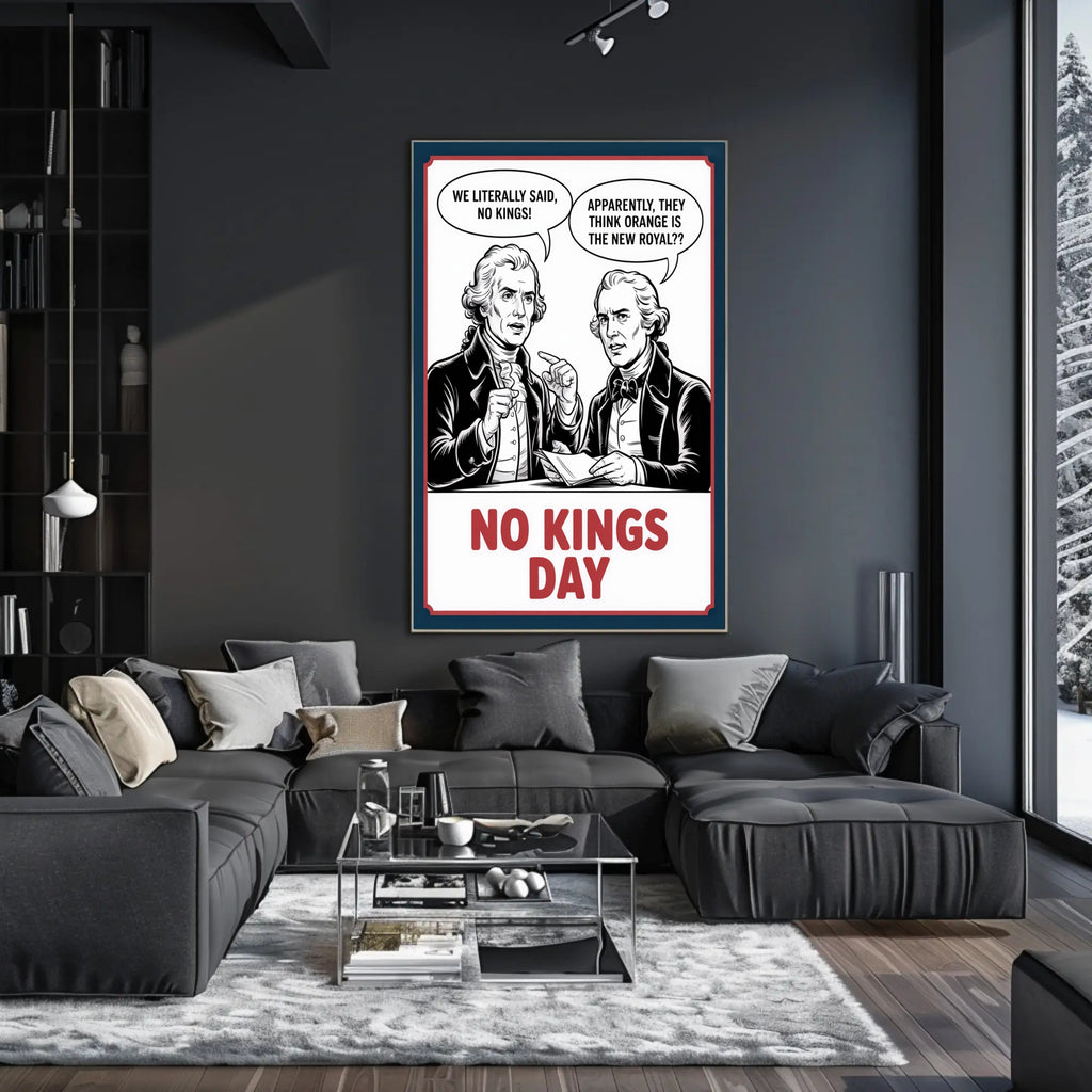 Conversation starter: Humorous speech bubbles and the large “NO KINGS DAY” headline turn a classic historical critique into contemporary political commentary.