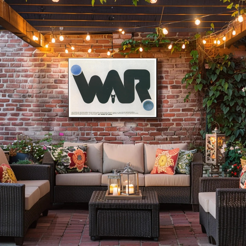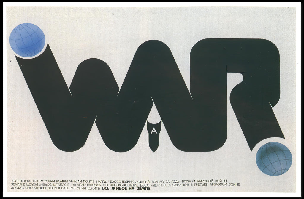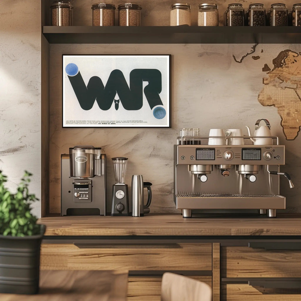 Powerful visual concept: Clean, high-contrast typography forms the word "WAR" while subtle graphic elements (globe spheres and a downward bomb motif) communicate urgency and the global stakes of armed conflict.