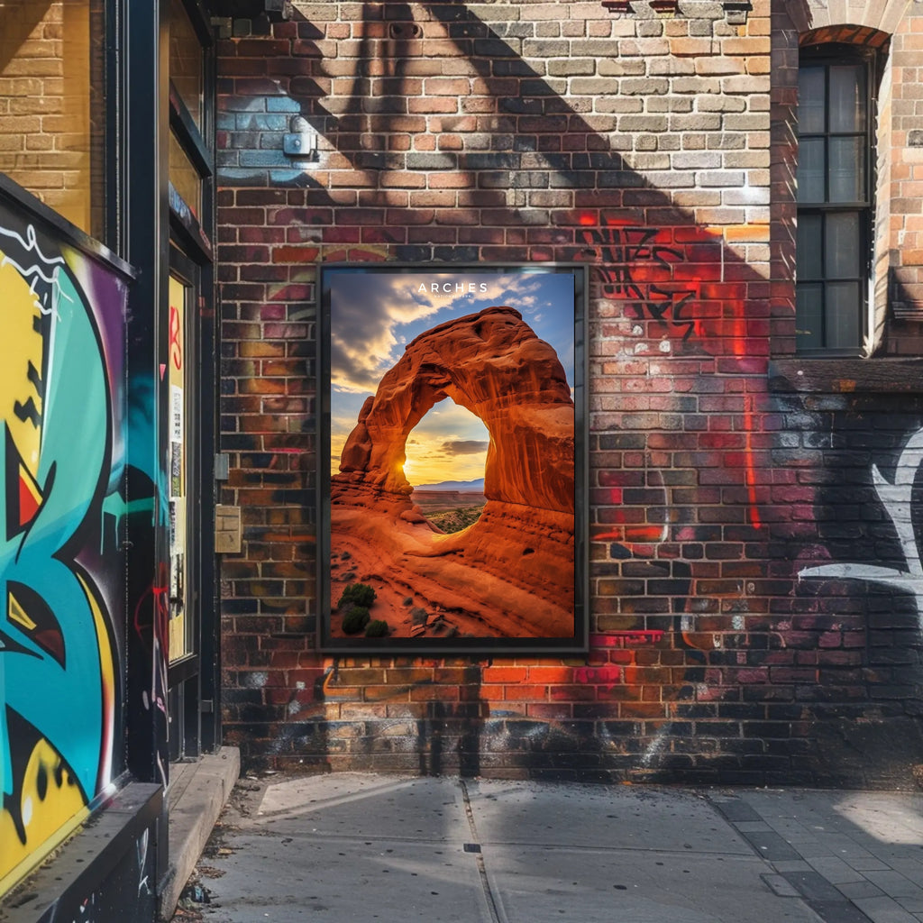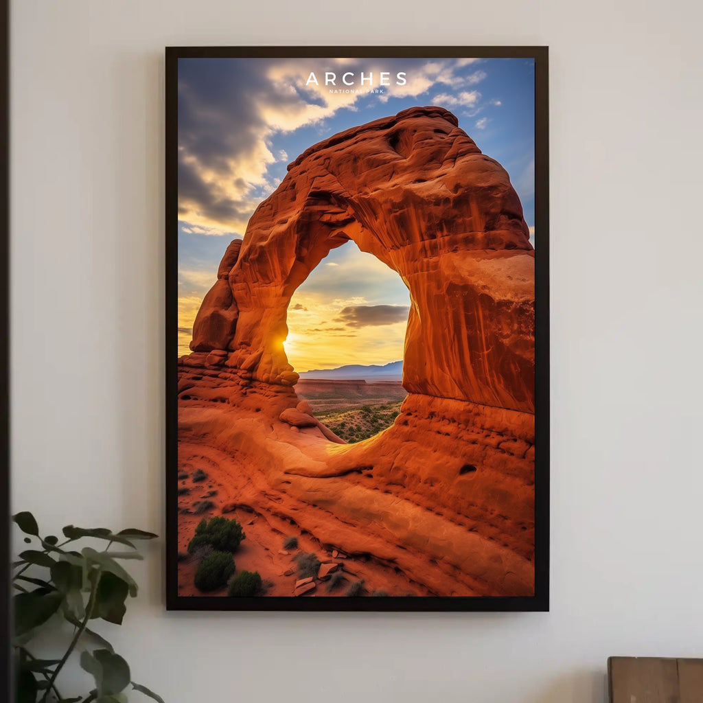 Bring the warm, golden-hour glow of Arches National Park into your living space with this striking travel poster from PosterGoat. The print showcases a majestic sandstone arch framed by a radiant sunset — vivid orange and red rock textures, a sunburst peeking through the opening, and a sweeping desert horizon under dramatic clouds. Designed for lovers of landscape art and minimalist decor, this piece transforms any wall into a window on Utah's iconic scenery.