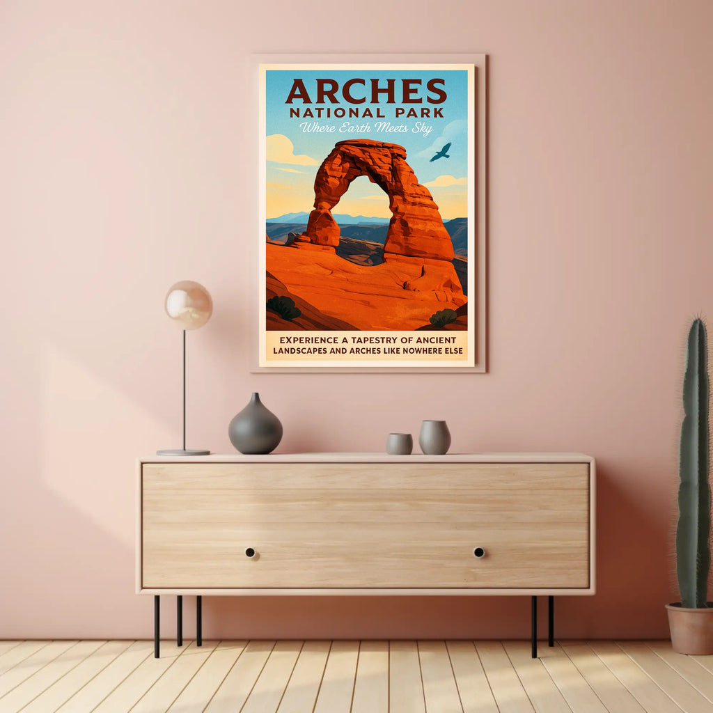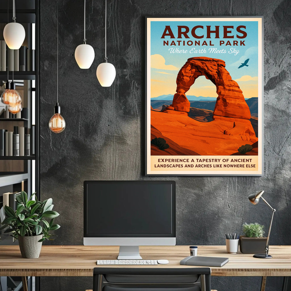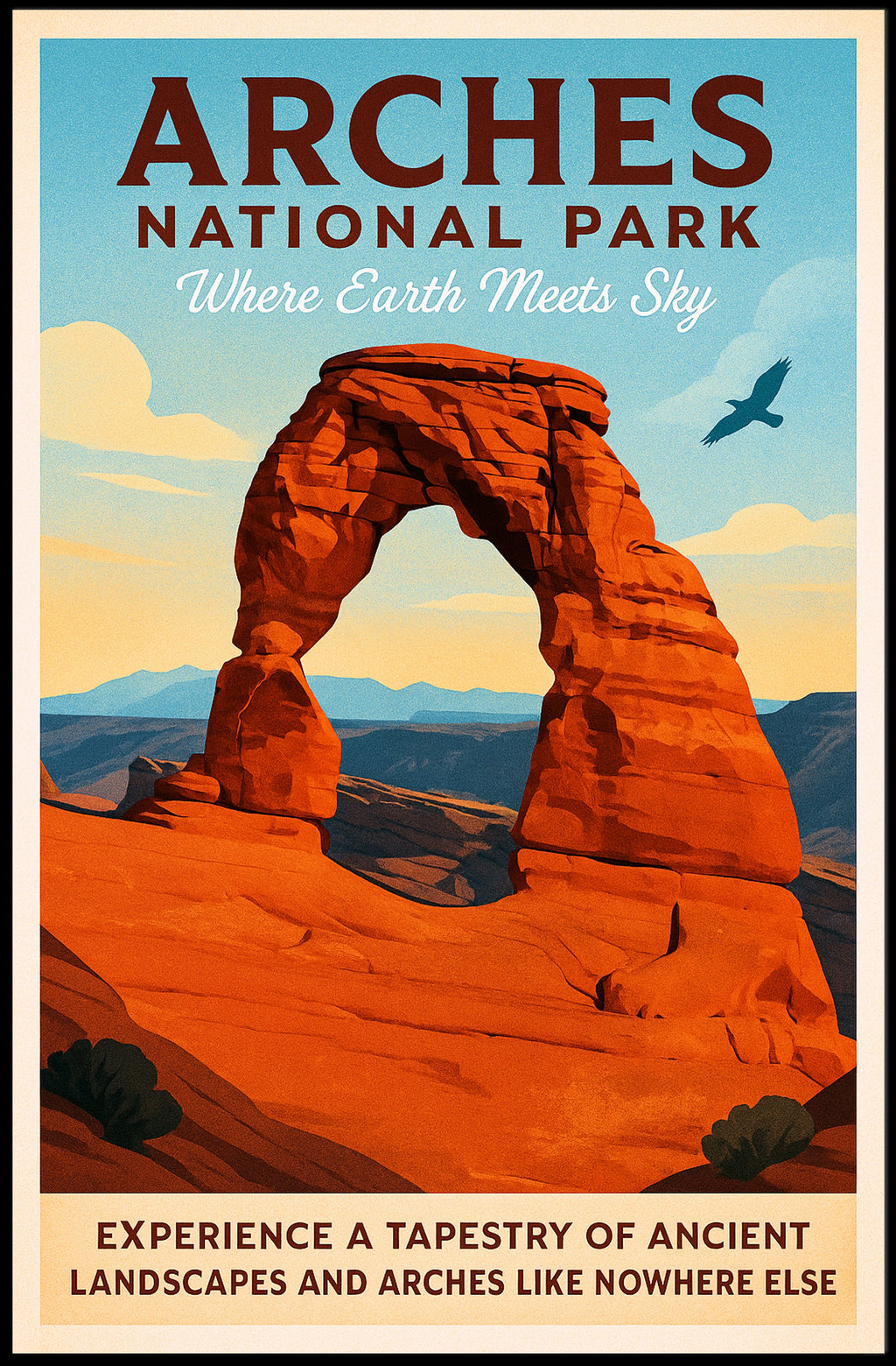 Arches National Park — Where Earth Meets Sky. Bring the iconic red sandstone of Delicate Arch into your home with this vintage-inspired travel poster from PosterGoat. Rich, sun-warmed tones, crisp sky-blue contrasts, and a soaring bird silhouette capture the sweeping drama of Arches National Park in a single, striking print.