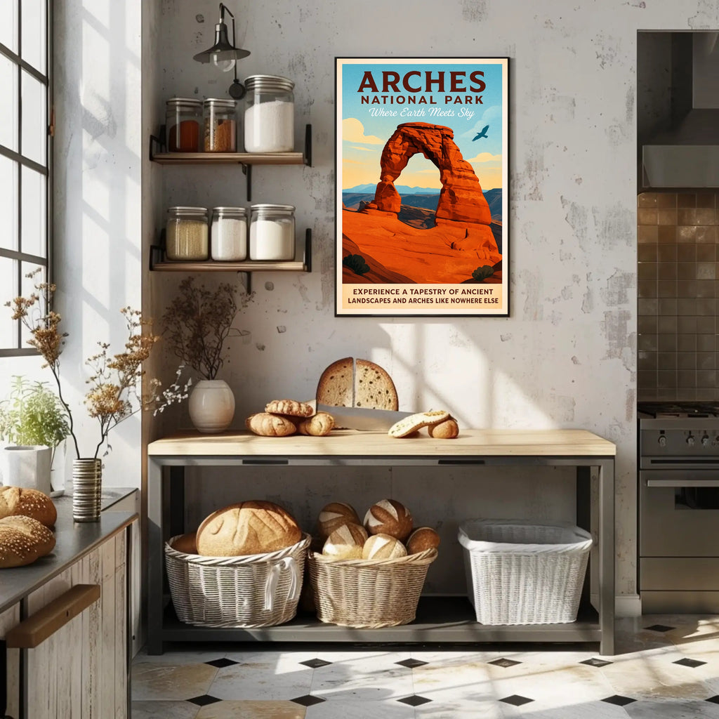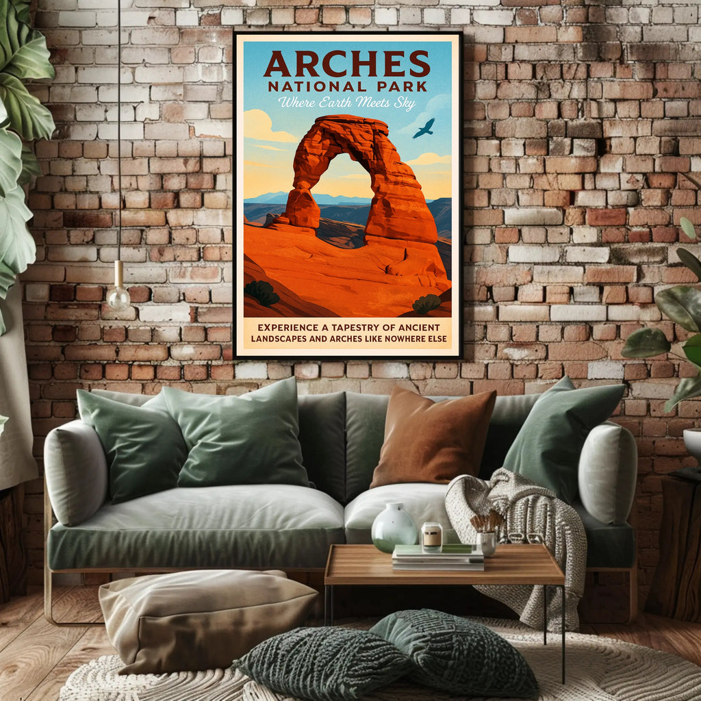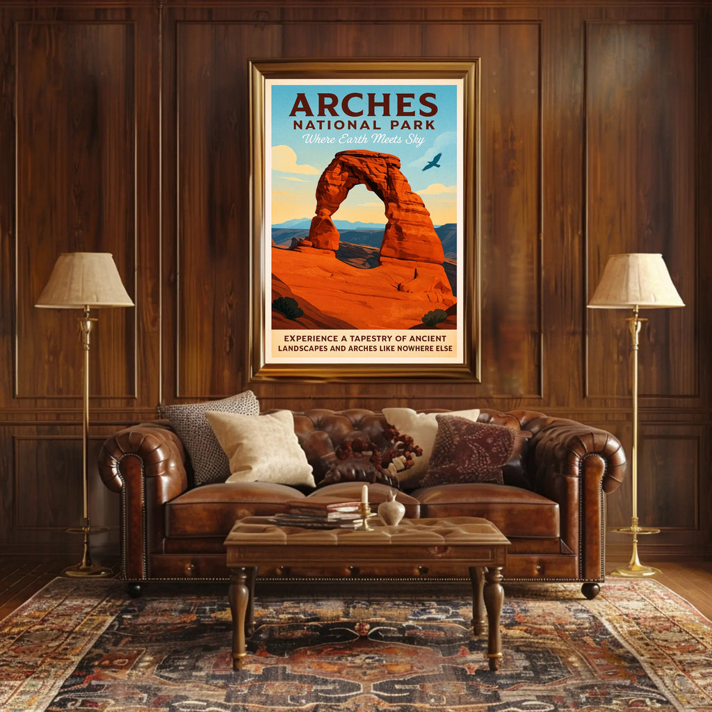 Arches National Park — Where Earth Meets Sky. Bring the iconic red sandstone of Delicate Arch into your home with this vintage-inspired travel poster from PosterGoat. Rich, sun-warmed tones, crisp sky-blue contrasts, and a soaring bird silhouette capture the sweeping drama of Arches National Park in a single, striking print.