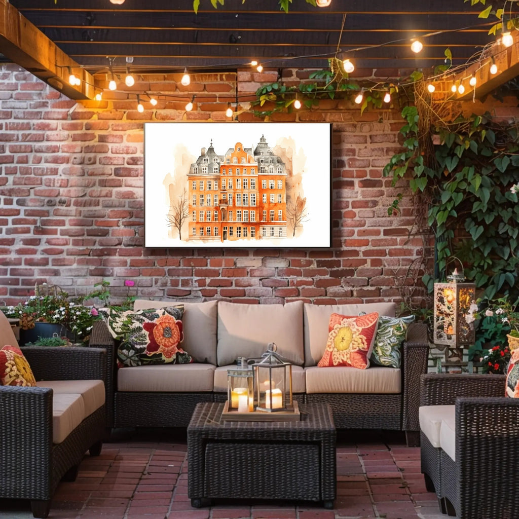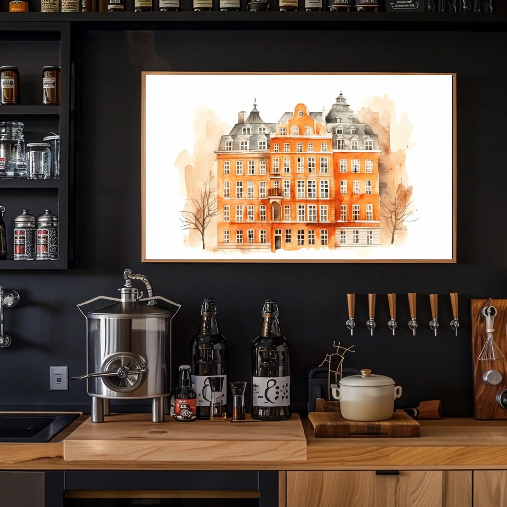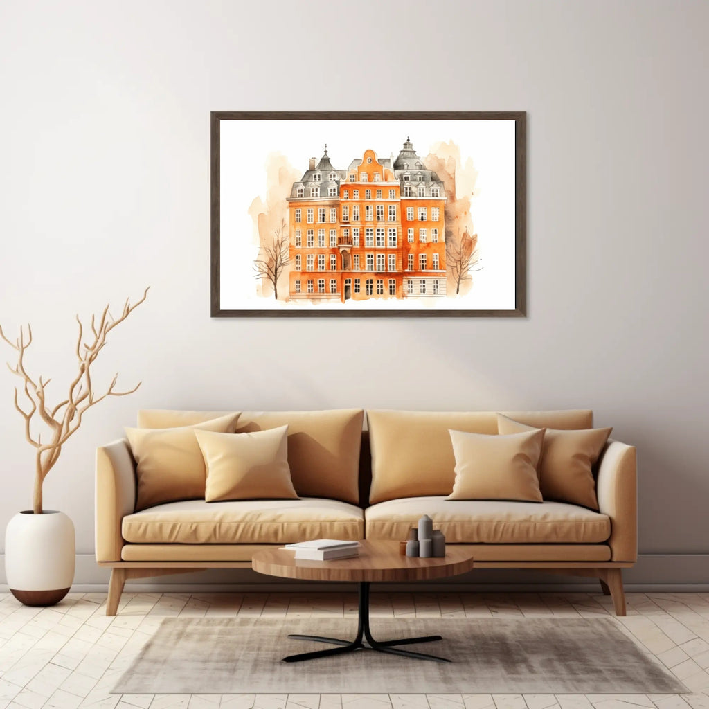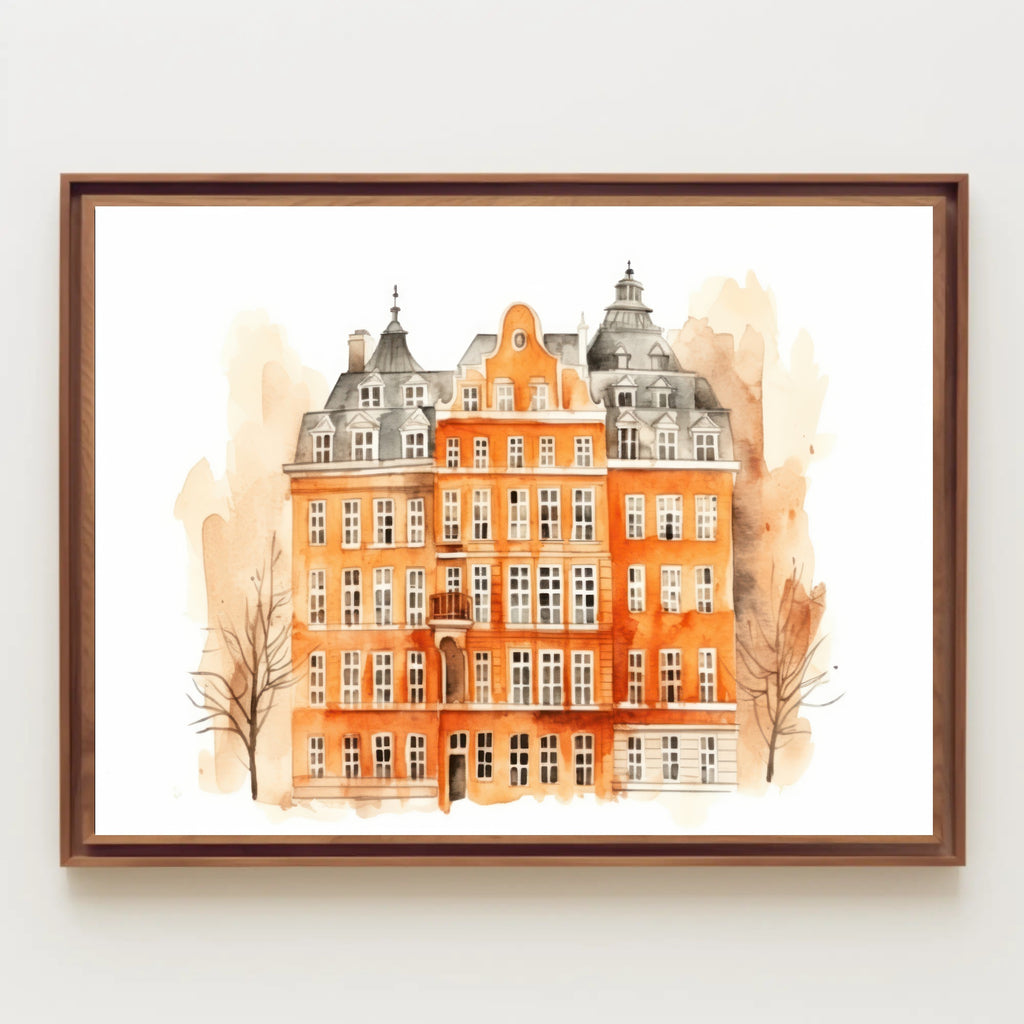Elevate your walls with the Architectural Elegance Poster from PosterGoat — a striking watercolor art print that captures the timeless charm of classic city architecture. This minimalist, sophisticated artwork features a warm orange façade, ornate mansard roofs, and rows of detailed windows set against a clean white background, making it a versatile focal point for contemporary and traditional interiors alike.