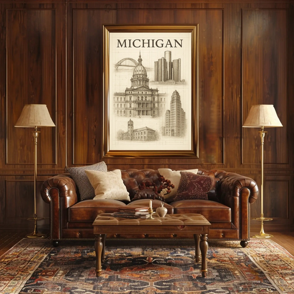 Printed as a premium poster, this piece brings the scenic spirit of Michigan's architectural landmarks into homes, classrooms, and offices. It serves as a stylish souvenir and a timeless addition to any wall art collection. Whether displayed on a living room wall, in a study, or on a gallery-style display, it invites admiration and sparks conversations about travel, design, and culture.