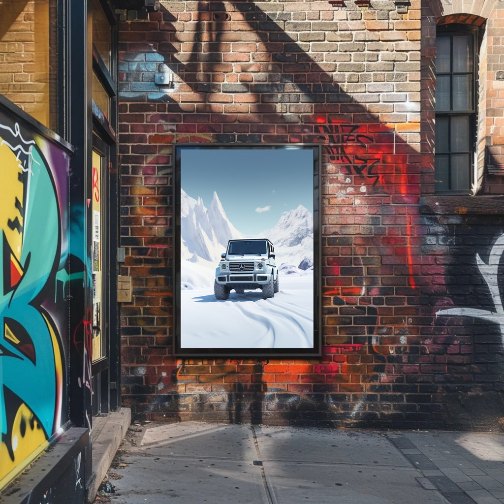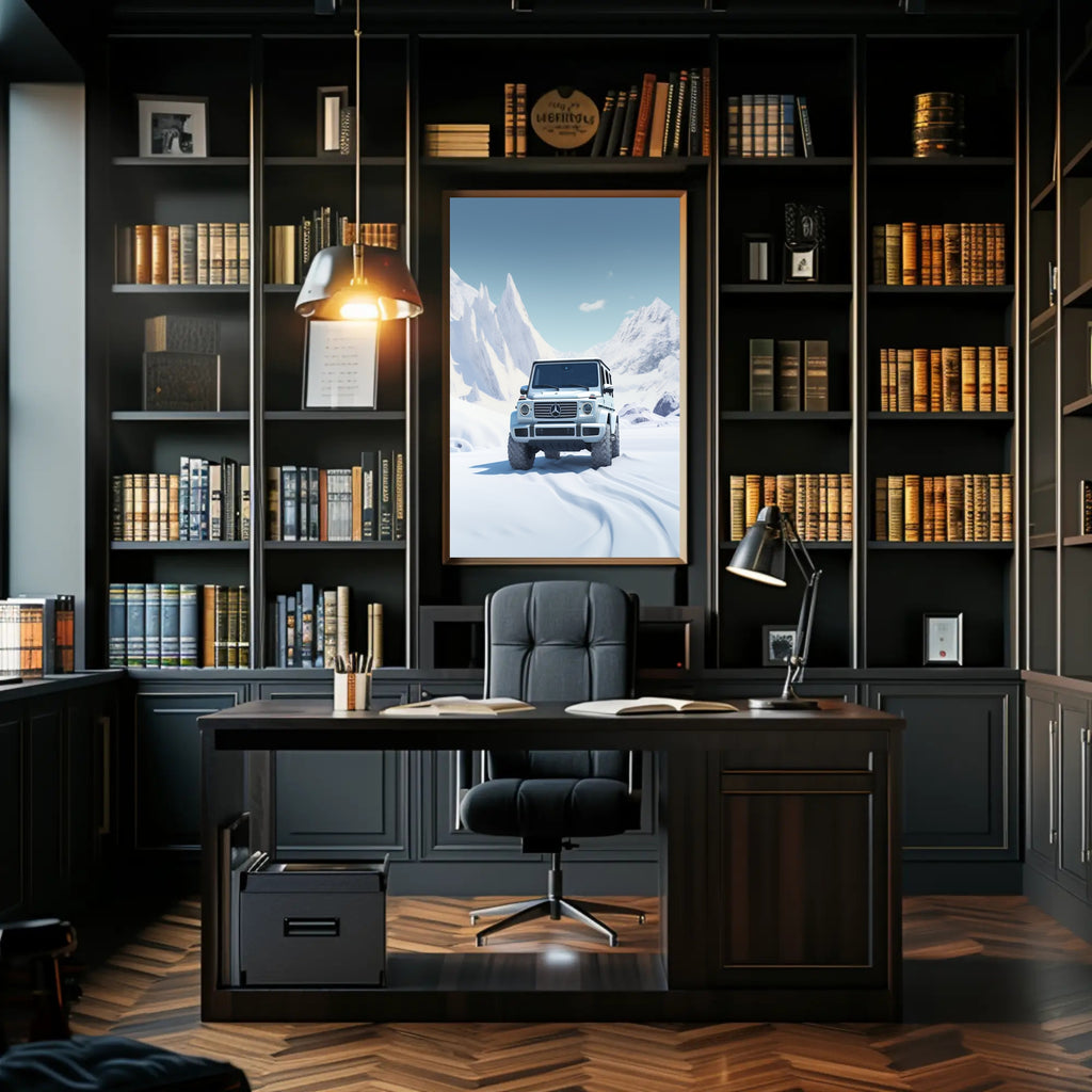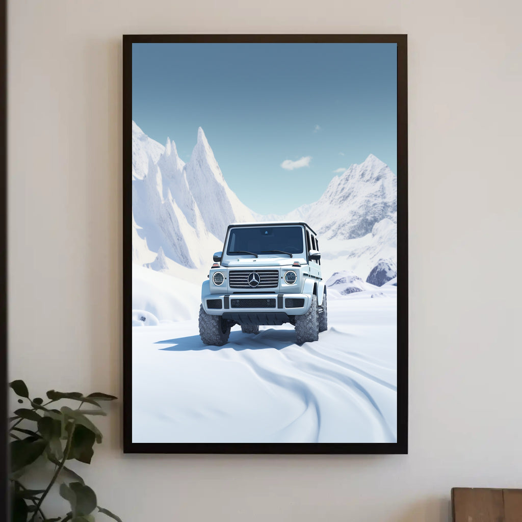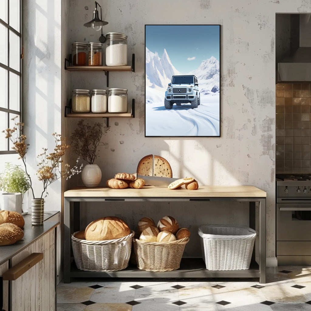 Striking visual focus: A bold, front-facing vehicle set against dramatic arctic mountains creates instant depth and a powerful focal point for any room.