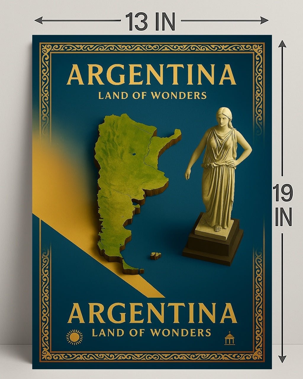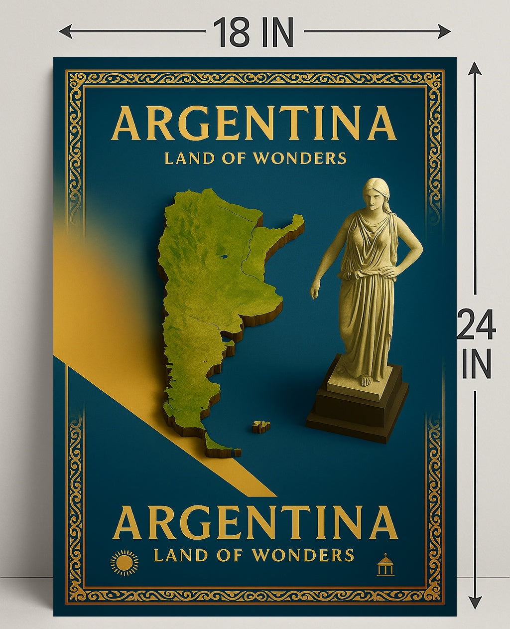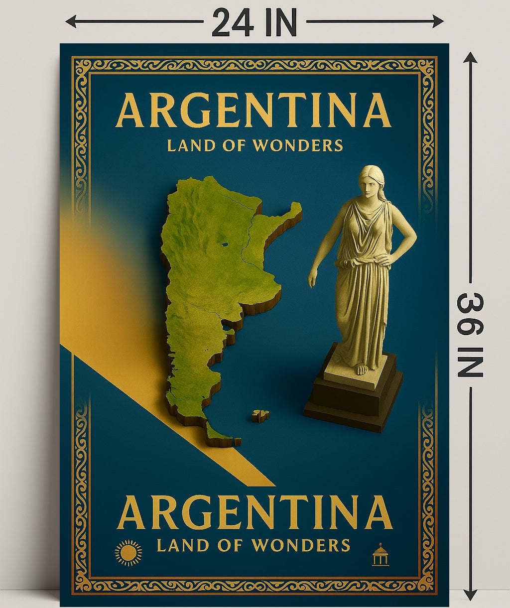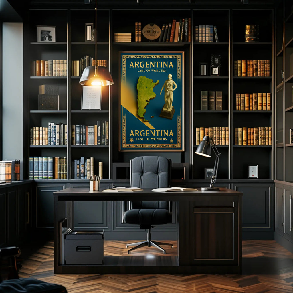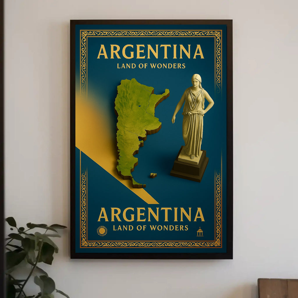 Argentina Land of Wonders Poster — an elegant travel-inspired print from PosterGoat that brings the spirit of Argentina into your home or office. Rich teal tones, gold foil-style typography and an ornately framed border combine with a raised, topographic map and classical statue to create a timeless piece of wall art that celebrates landscape, culture and wanderlust.