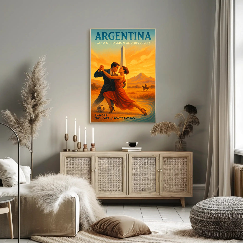 Bring the fiery spirit of Buenos Aires into your home with the Argentina Tango Dance Passion Cultural Poster from PosterGoat. This evocative pop-art style print captures a passionate tango embrace set against a sun-washed landscape — the iconic obelisk, distant mountains, a lone gaucho, and even a subtle football at their feet — all rendered in warm, vintage-inspired hues that radiate movement and romance.