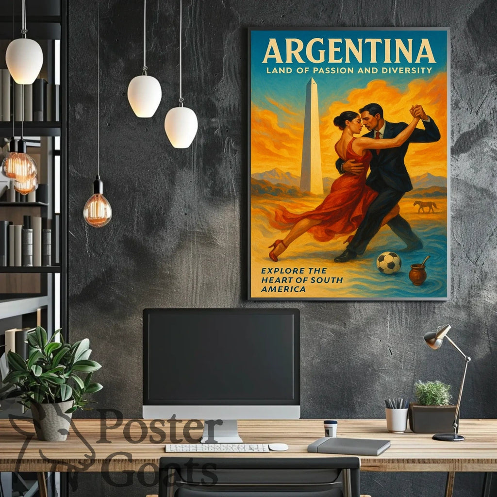 Dive into the heart of Argentina with this vivid poster that encapsulates the country's vibrant culture and rich heritage. At its center, a couple passionately dances the tango, a dance synonymous with Argentine identity. The Obelisk of Buenos Aires stands tall in the background, a symbol of historical significance. The addition of a soccer ball and mate gourd evokes local traditions, while a distant horse reflects Argentina's rural beauty. With its expressive artistic style and warm colors, this poster captures the essence of South America, offering a modern yet timeless representation of Argentine passion and cultural richness.