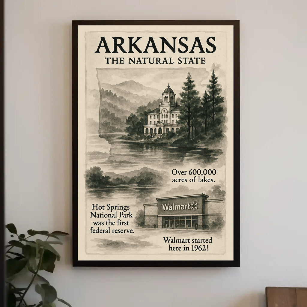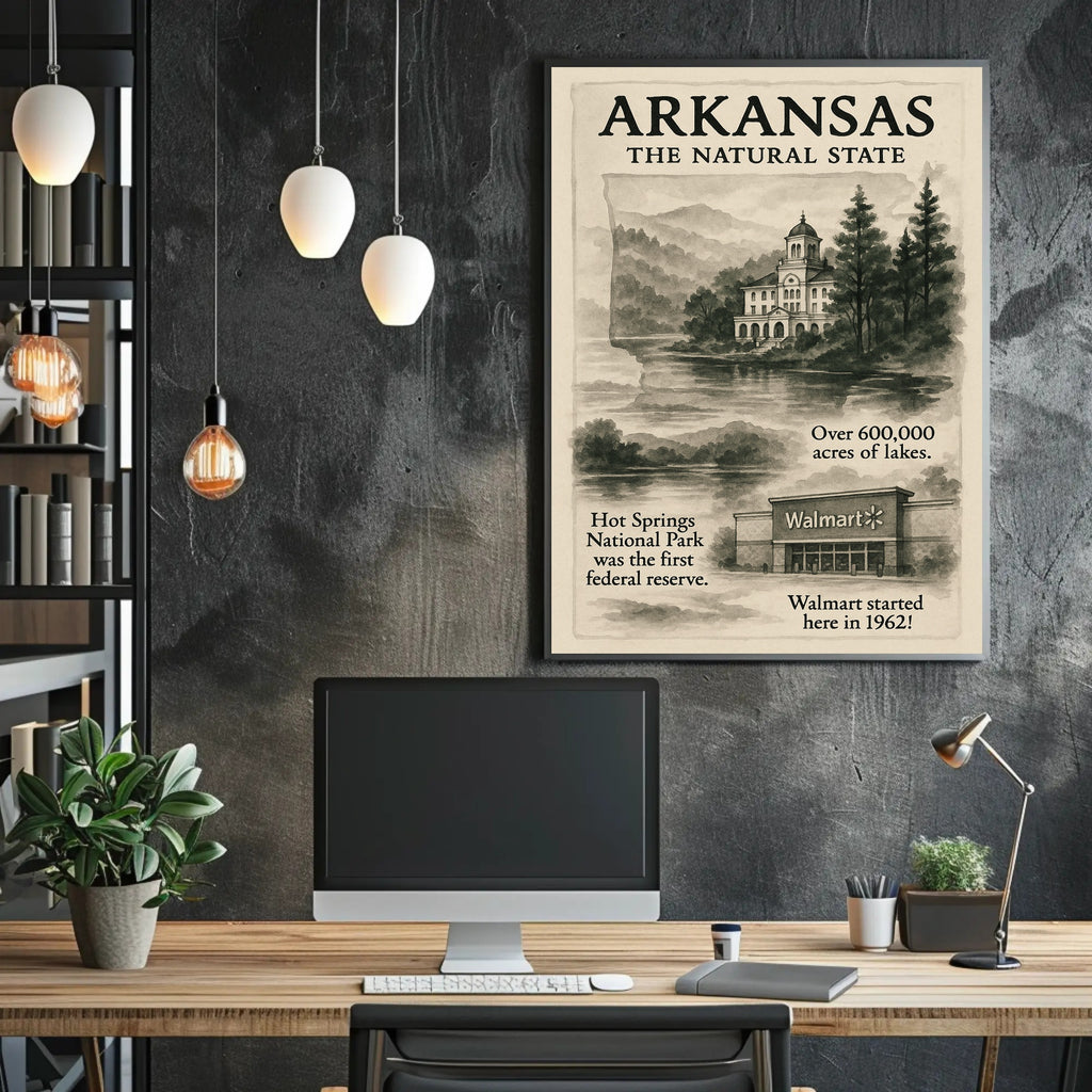 Celebrate Arkansas with classic vintage style. This Arkansas The Natural State Poster from PosterGoat blends a nostalgic, monochrome watercolor aesthetic with travel facts and iconic imagery — a scenic art print that captures the state's lakes, Hot Springs National Park and the humble beginnings of Walmart in a single, eye-catching composition.