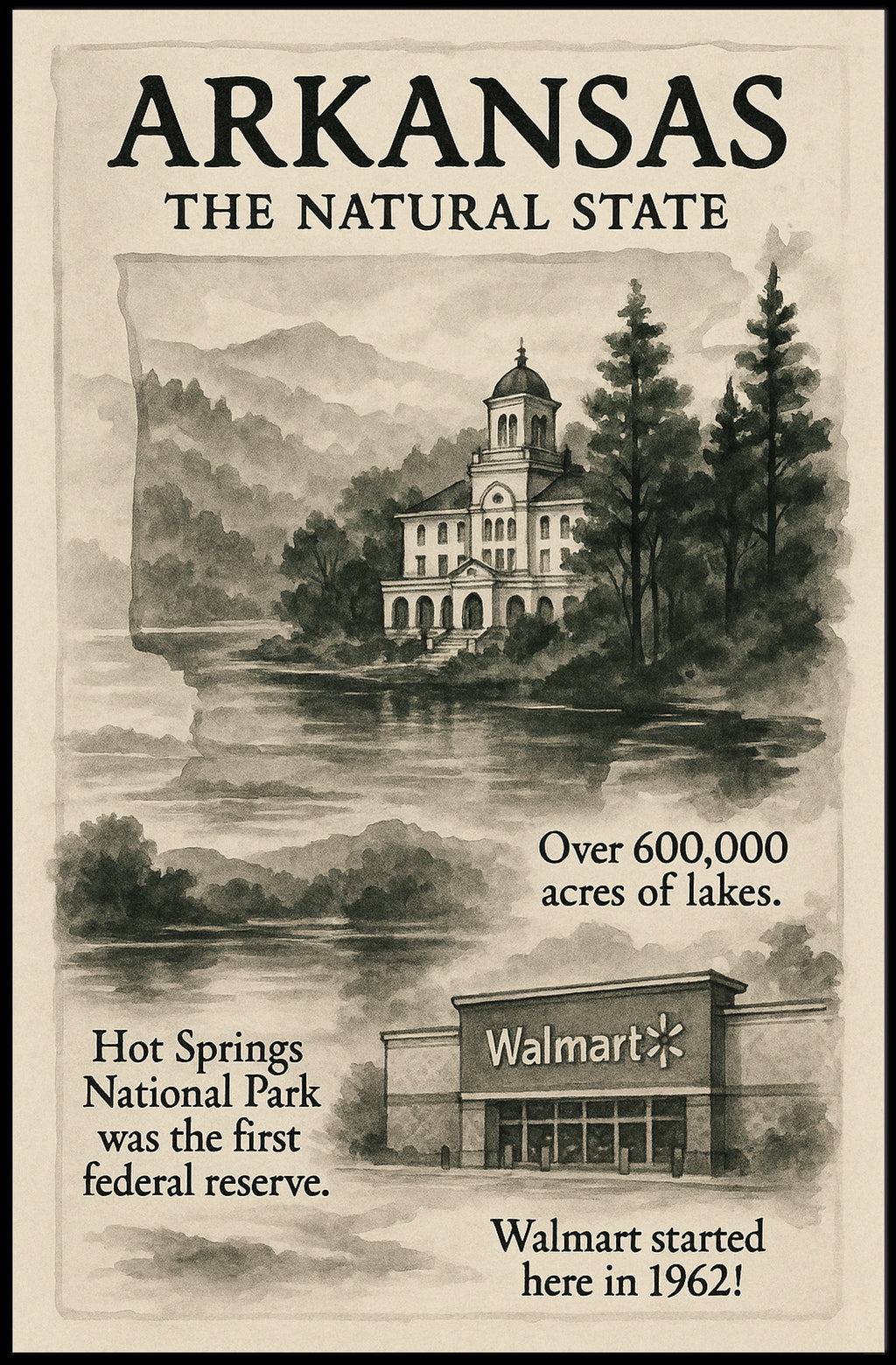 Features: vintage typography, watercolor landscape, subtle state facts — "Over 600,000 acres of lakes," "Hot Springs National Park was the first federal reserve," and "Walmart started here in 1962!"