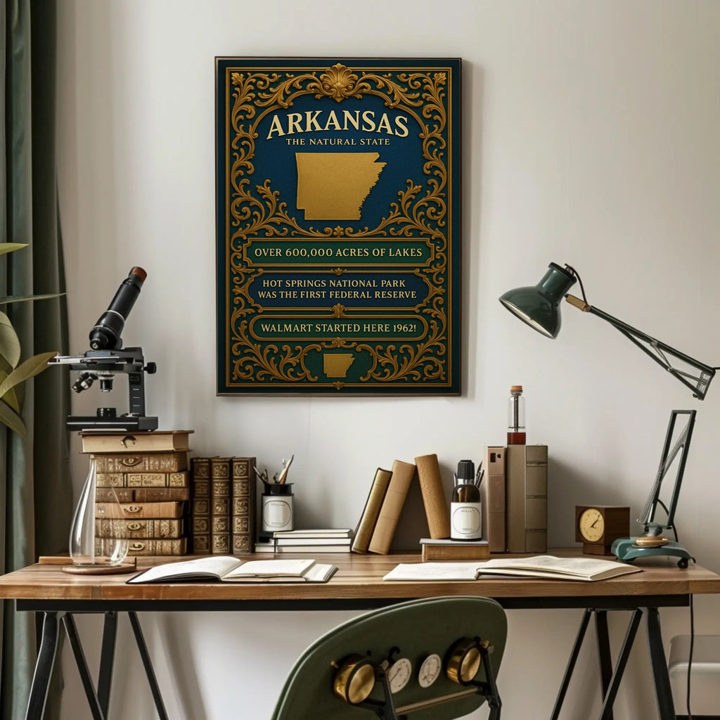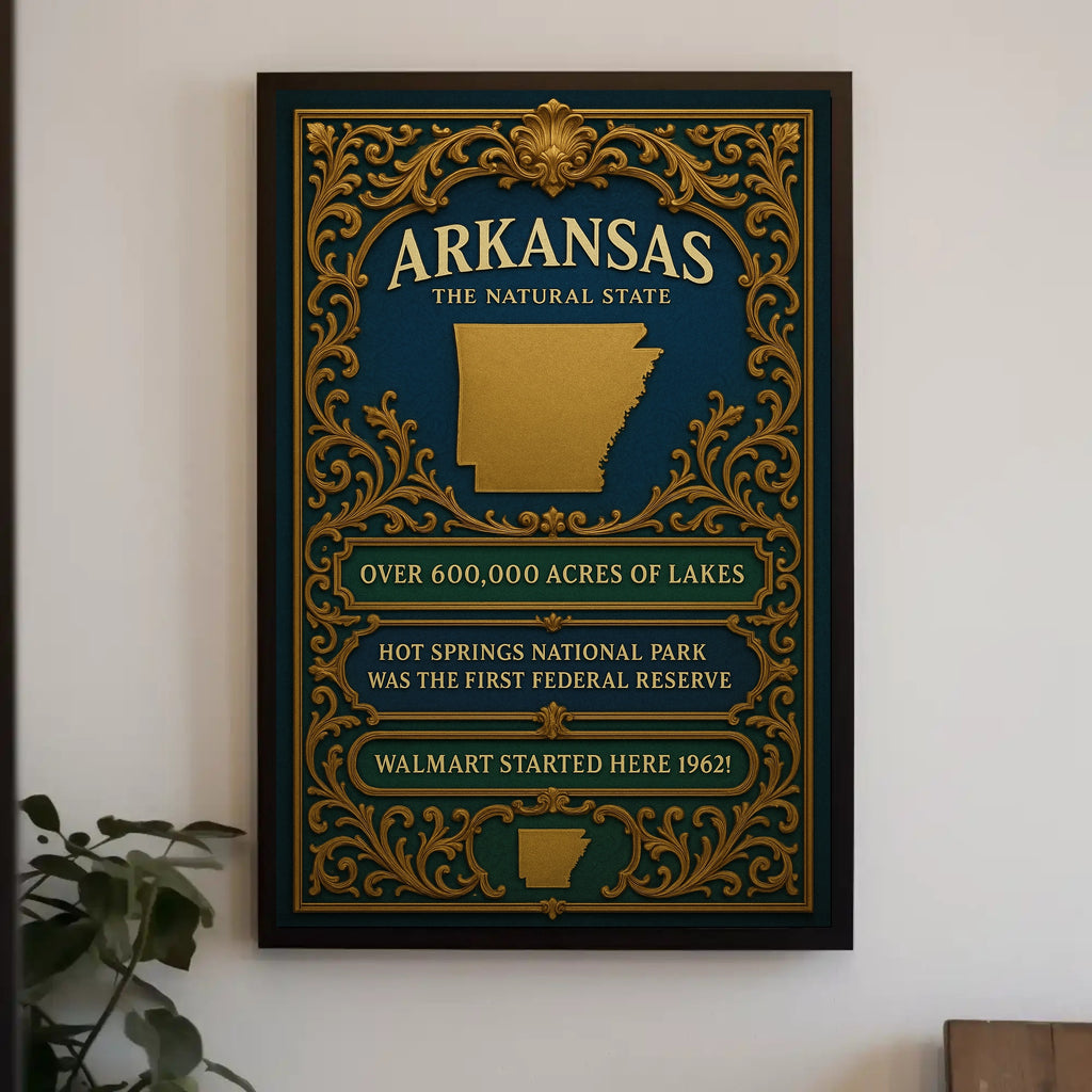 Iconic Arkansas details: Features a bold Arkansas silhouette and celebrated state facts — over 600,000 acres of lakes, Hot Springs National Park’s historic status, and the birthplace of Walmart — rendered in clean, readable type.