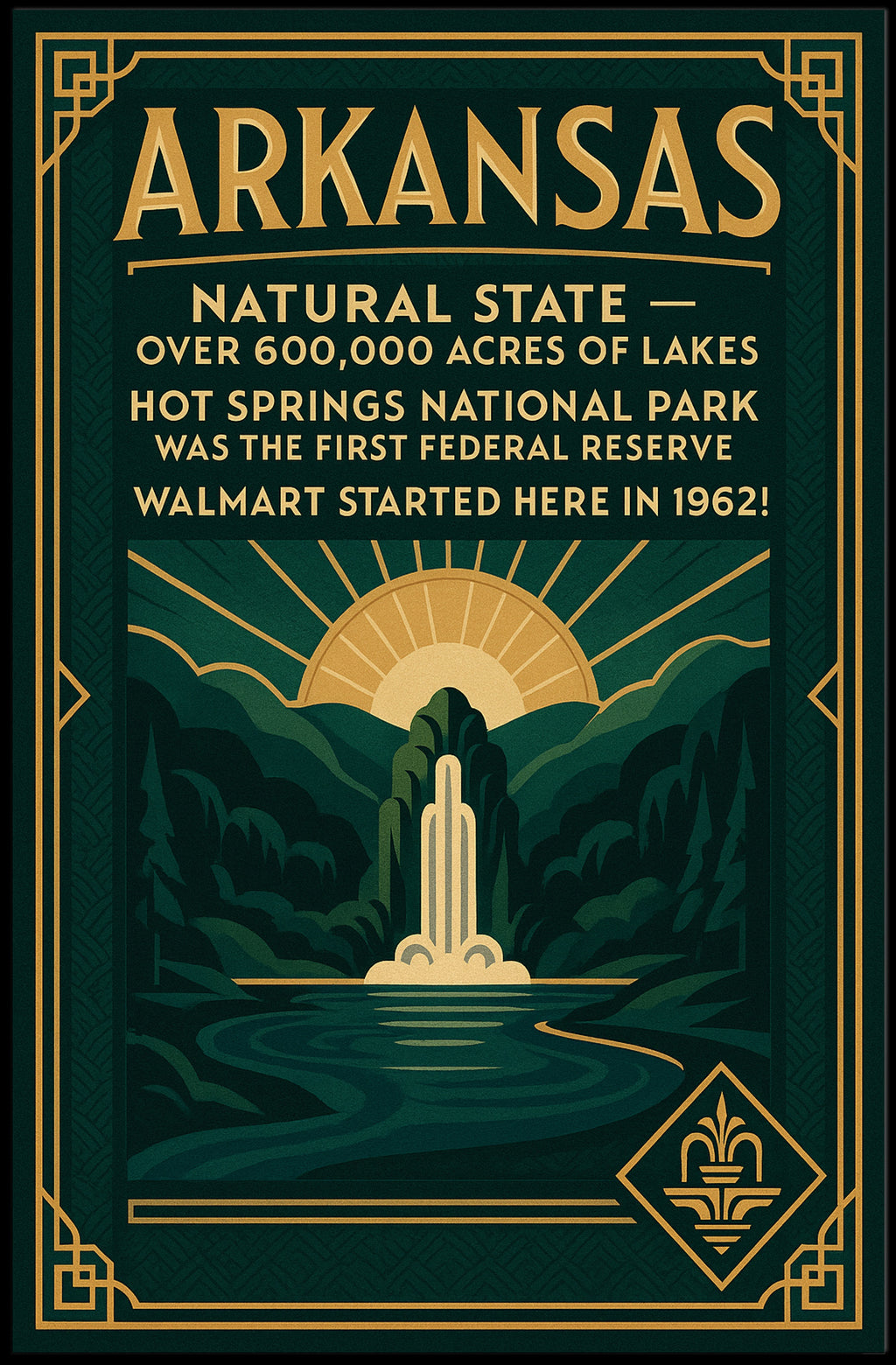 Arkansas — The Natural State Poster from PosterGoat brings vintage travel-poster charm to your walls with deep emerald tones, gold art-deco accents, and a stylized scenic composition that celebrates Arkansas' lakes, Hot Springs, and natural beauty.