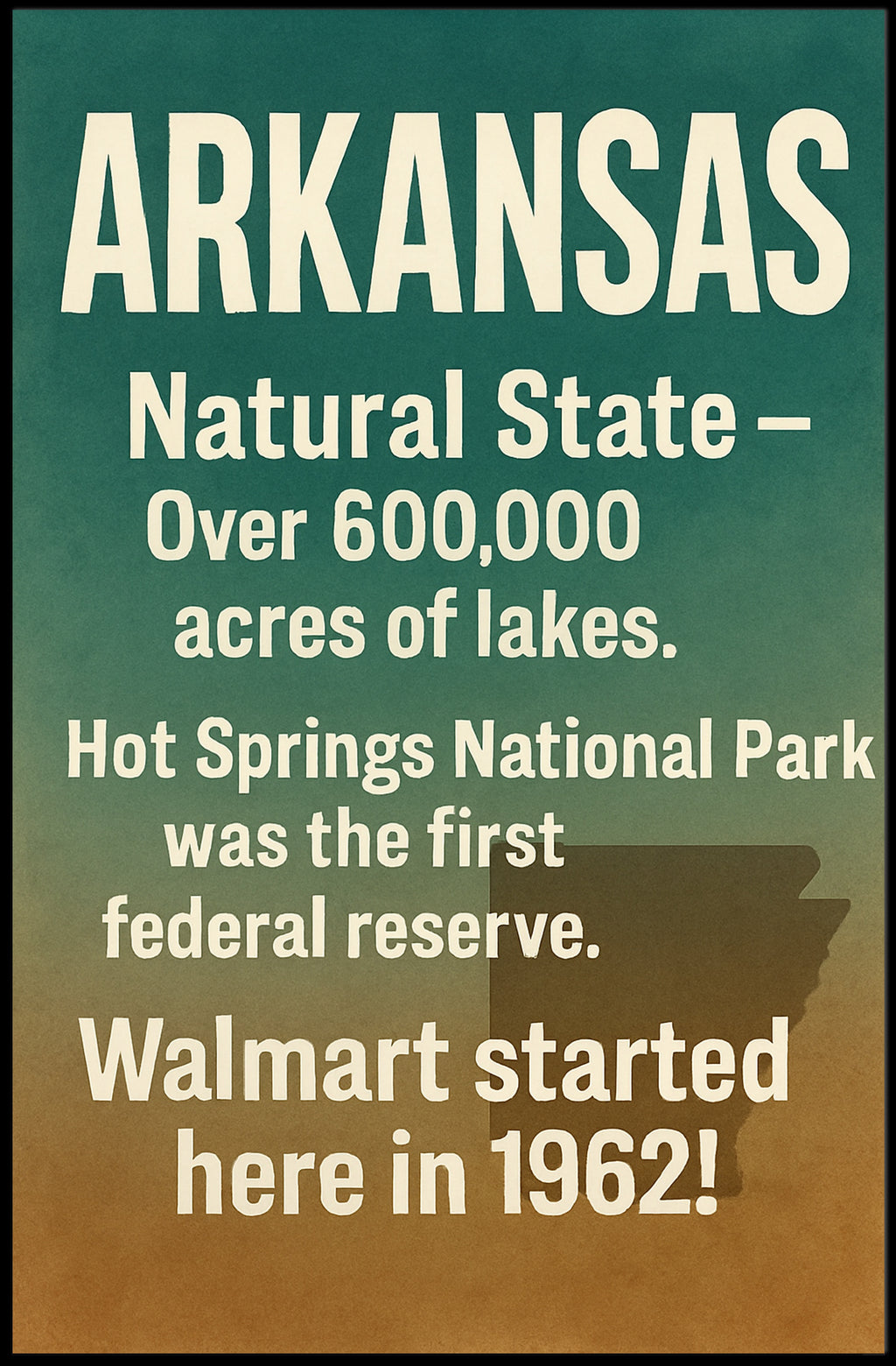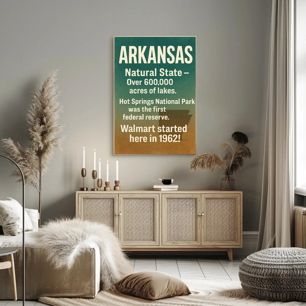 This scenic poster highlights fun Arkansas facts in large, easy-to-read type: over 600,000 acres of lakes, Hot Springs National Park’s historical status, and the birthplace of Walmart in 1962 — perfect for home, office, cabin, or as a meaningful souvenir or gift.