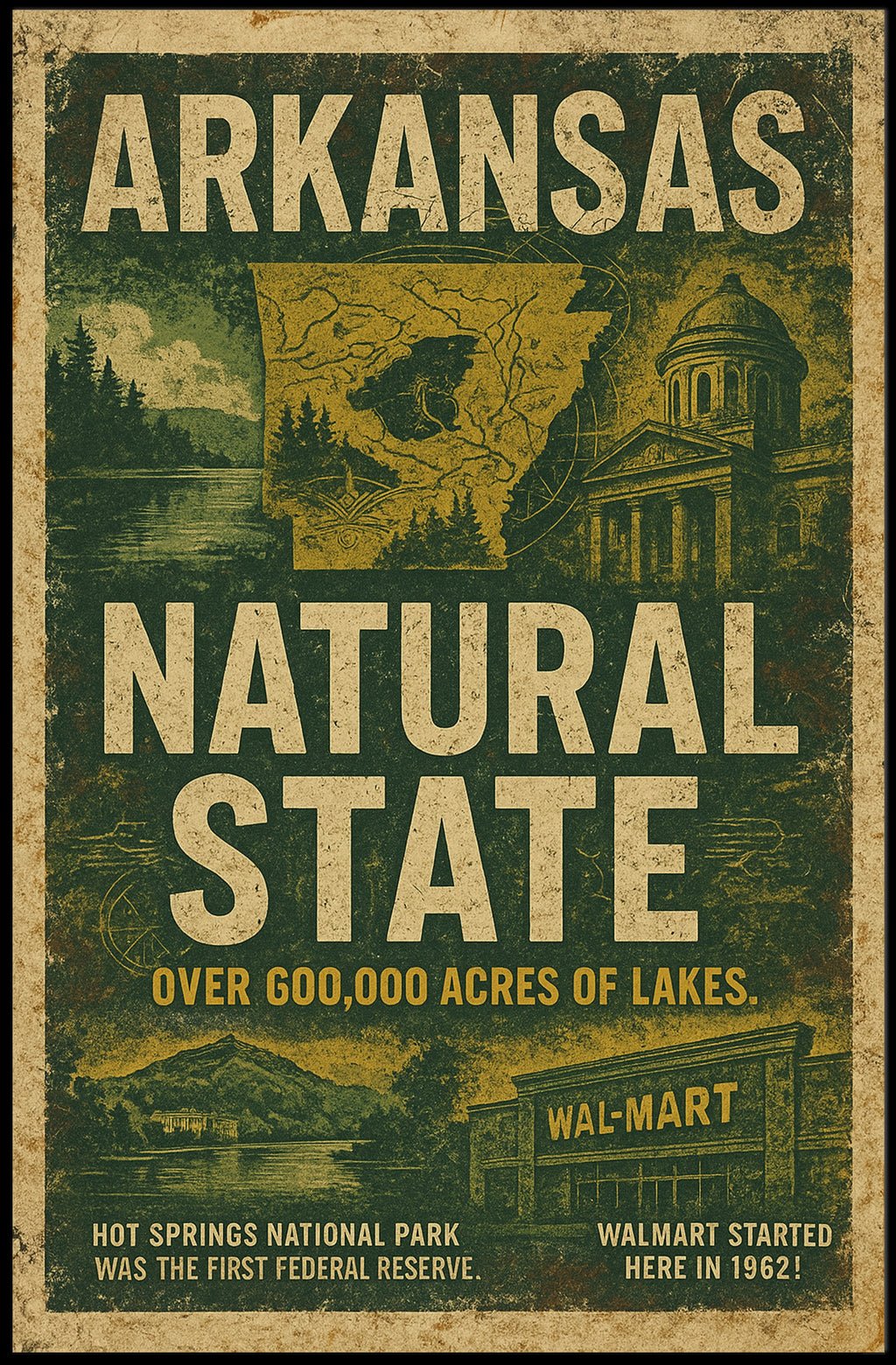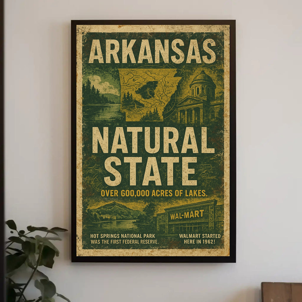 Designed for decor lovers and travel-minded collectors, the poster's textured, weathered finish and bold typography create a striking focal point in living rooms, offices, cabins, or entryways. The art highlights Arkansas' natural lakes, Hot Springs' historic significance, and the state's hometown roots — all rendered in an antique color palette that complements both modern and traditional interiors.