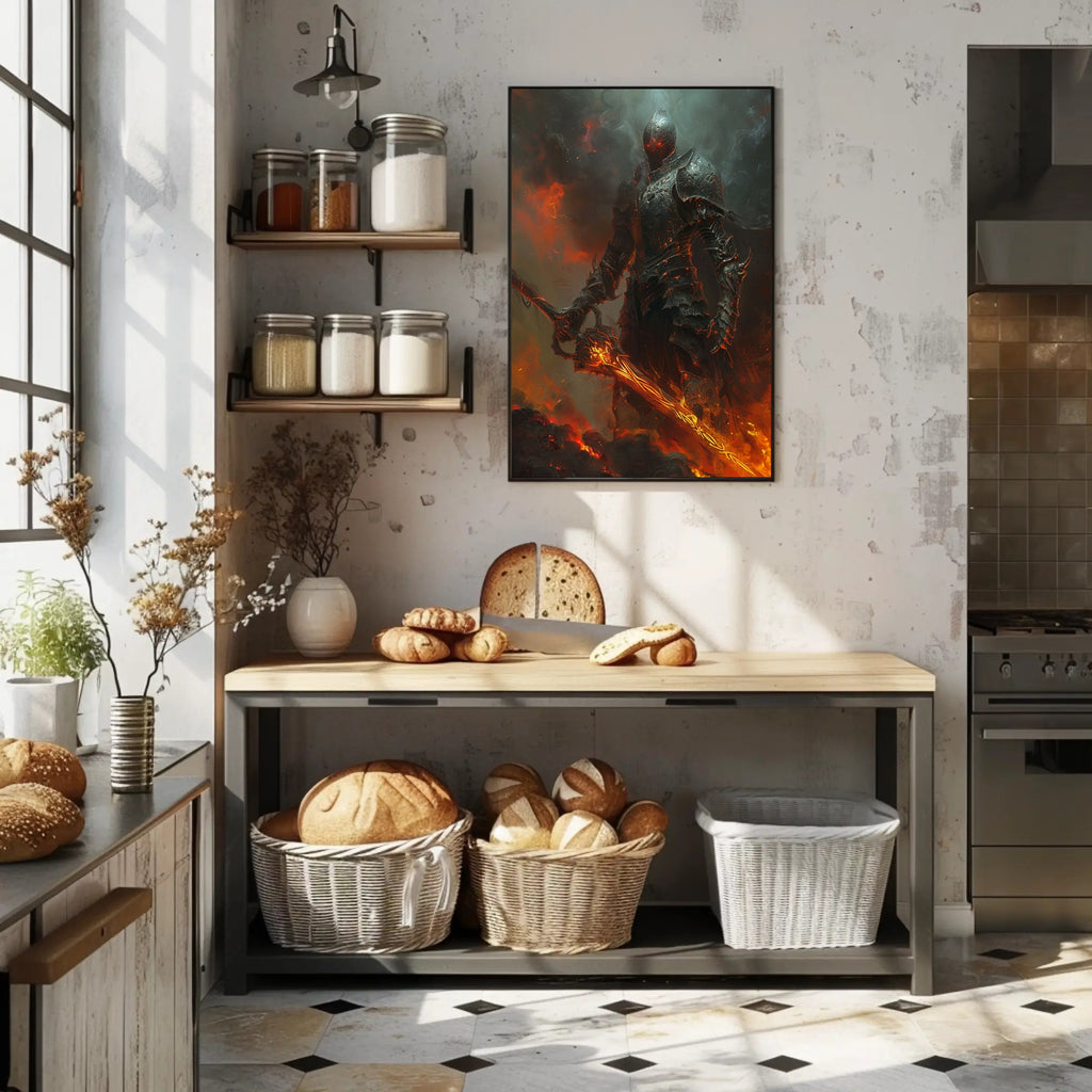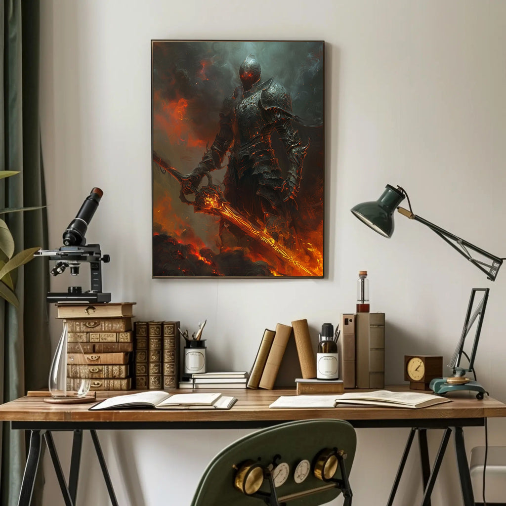 Bring the legend home: Add the Armored Knight in Fiery Realm poster to your collection today and transform your decor with a striking piece of fantasy wall art from PosterGoat — order now to make this menacing warrior the centerpiece of your space.