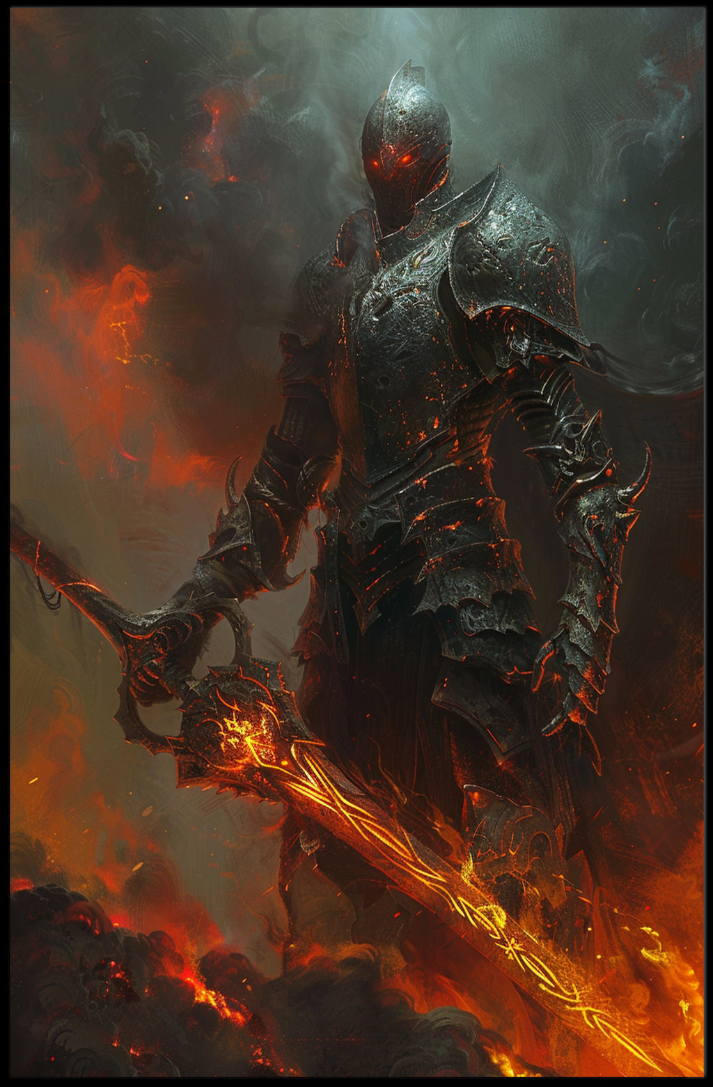 Summon an otherworldly presence to your walls with the "Armored Knight in Fiery Realm" poster from PosterGoat. This dramatic fantasy artwork captures a menacing, fully armored knight standing amid smoke, embers and molten light — a photorealistic composition that blends dark surrealism with high-fantasy storytelling. The knight's scorched plate, glowing red eyes and a blazing, rune-carved sword create an unforgettable focal point that draws the eye and sparks the imagination.