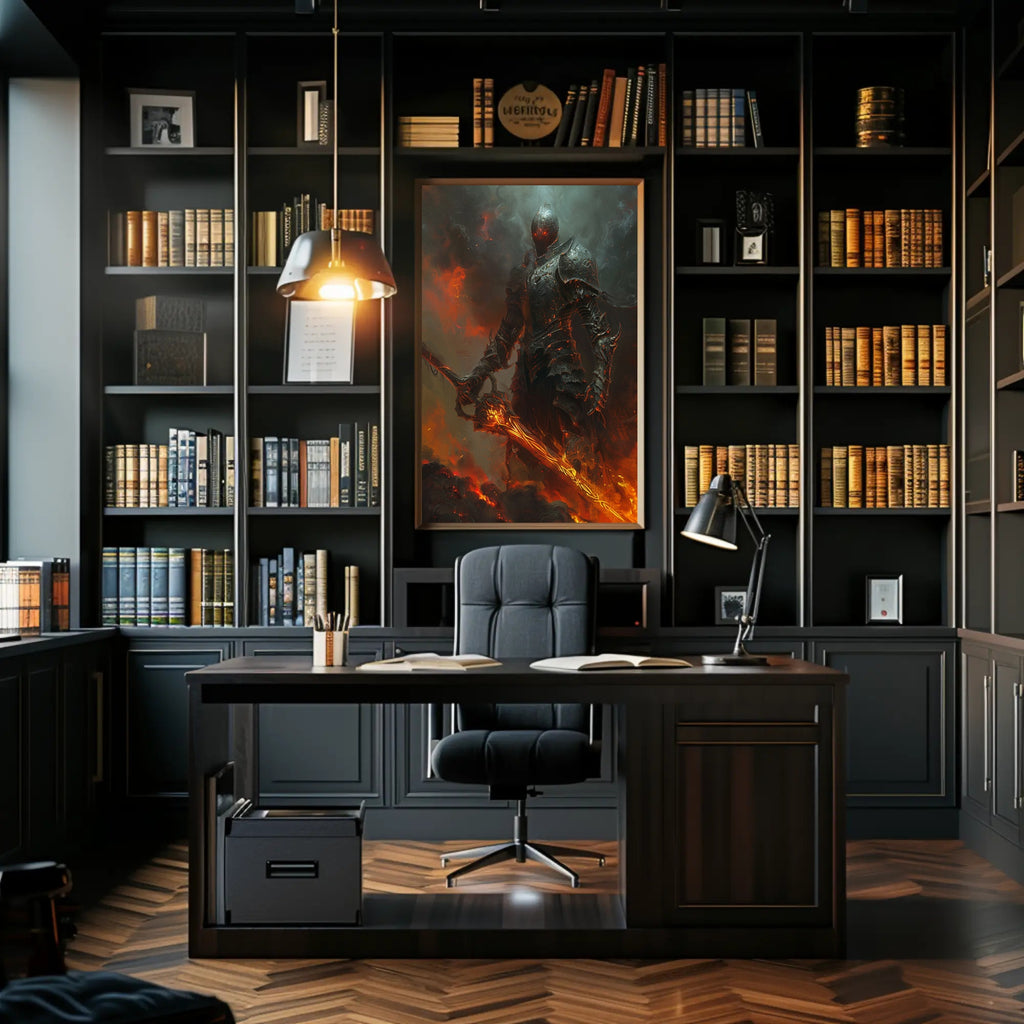 Why collectors and fantasy fans choose this poster: the intense contrast between shadowed, textured armor and vibrant molten highlights gives the piece gallery-level impact. Fine detailing in the gauntlets, layered plate and ornate sword is rendered with photorealism-style precision, while the fiery environment and drifting ash convey motion and menace. Ideal for game rooms, studios, living spaces, or any wall that needs a bold, mythic statement.