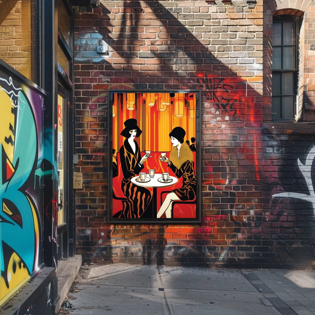 Capture the glitz and social charm of the Jazz Age with the Art Deco Café Scene: Elegant 1920s Style Cultural Poster from PosterGoat. Rich, warm hues of red, orange and gold pair with bold geometric lines to recreate a sophisticated café moment — two fashionable women in cloche hats and fur-trimmed coats, steaming cups arranged on a round bistro table, and stylized lanterns cascading above. This poster brings vintage fashion, cultural nostalgia, and Art Deco design into any Home & Garden décor collection.